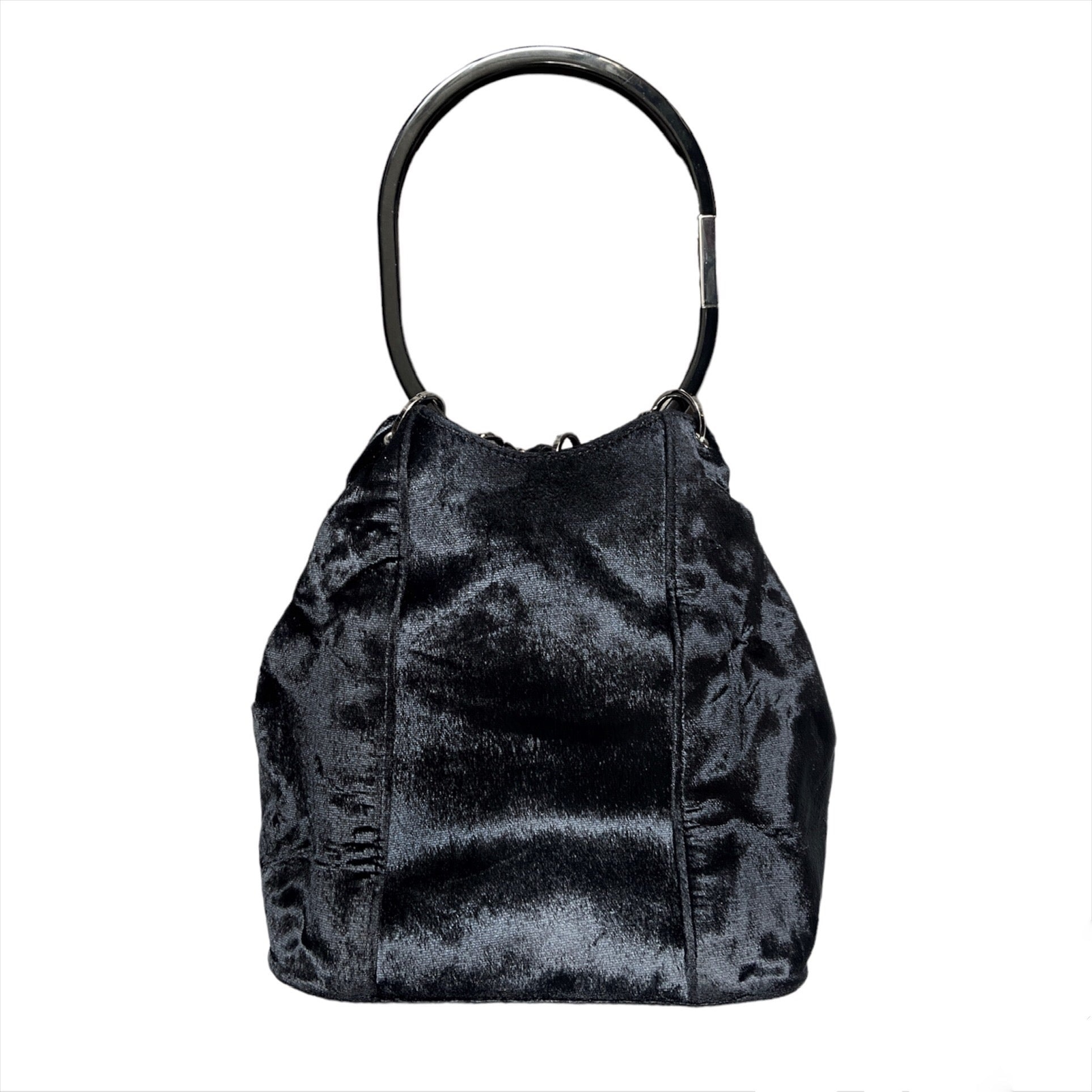 Gucci Fall 1999 Tom Ford black velvet acrylic ring bucket handbag Length:8” Height:8” Width:4.5” Acrylic hoop handle 9.25" long & 7.5" wide Notes: Exquisite handbag from the Gucci Fall/Winter 1999 collection designed by Tom Ford Featured on the runway and campaign, shot by Mario Testino featuring Liisa Winkler This is a smaler iteration, compared to one we have also acquired Crafted from luxurious silk velvet Acrylic ring hoop with silver branded plate The interior is lined with soft fabric and features a small zip pocket. Can be opened or closed fairly easily Can be worn on shoulder or just on the arm Composition: 100% silk + metal parts + acrylic ring Condition: 4/5 (Mint condition, little to no signs of use) Defects: Some slight scratches to the outer of the bag, not significant