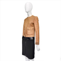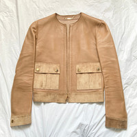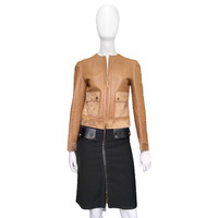 Gucci fall 2001 Tom Ford beige gold zip leather jacket Sz:40 We also have a matching black skirt available. Items sold separately. This Tom Ford for Gucci 2001 fall leather jacket and gold buttons, complete with a central zip. It is in excellent condition, with minor wine staining barely visible on the sleeve. Sleeves have a comfortable layer of rayon lining. Measurements: Shoulders:16” Chest:18” Length:20” Sleeves:24” $400