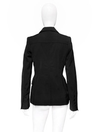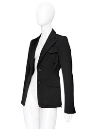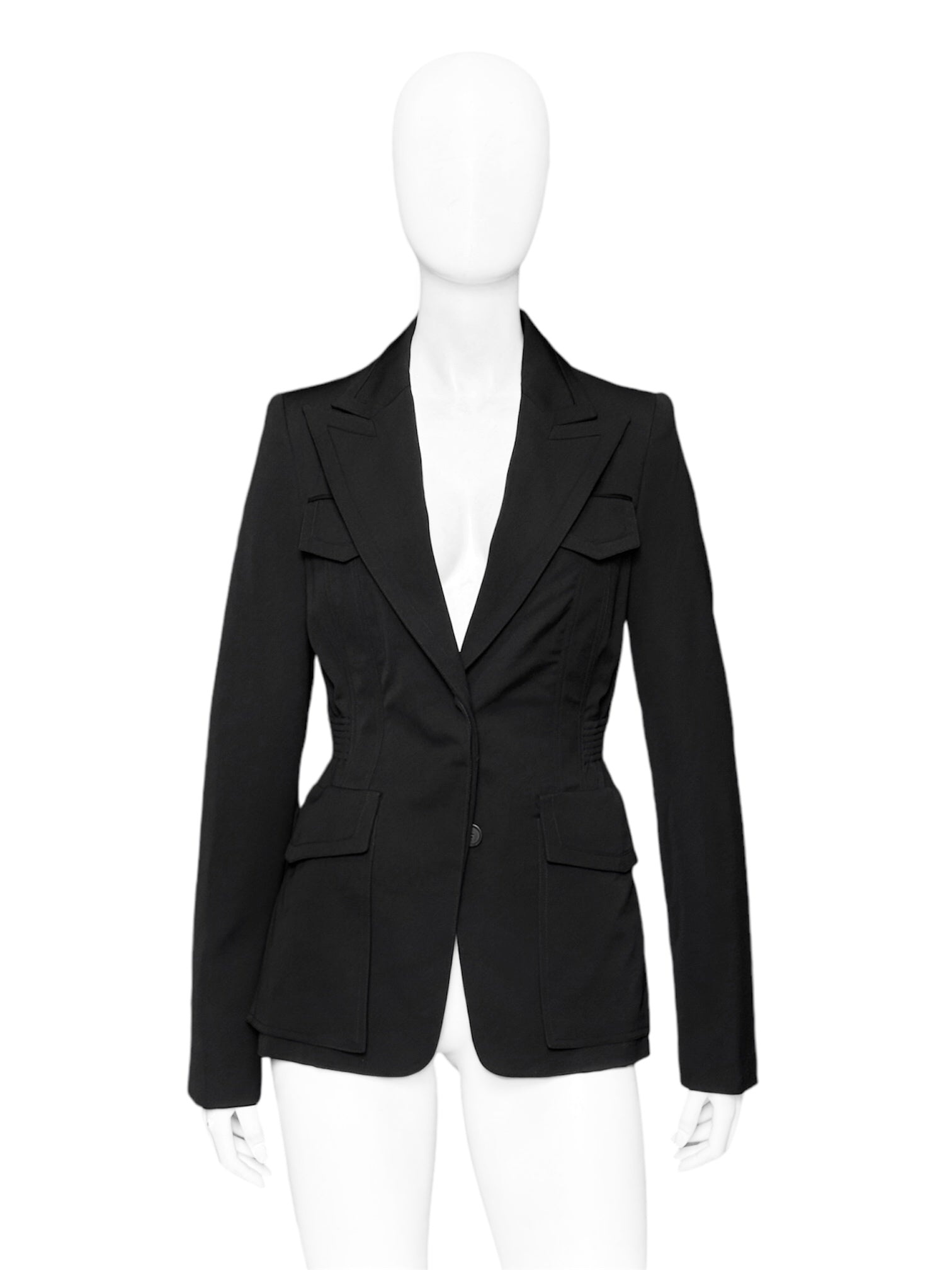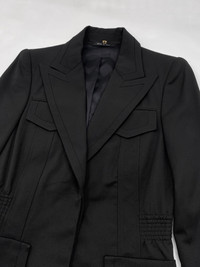 Gucci Fall 2003 Tom Ford Black Wool Military Blazer Jacket 40 Size: 40 Shoulder: 16” Armpit to armpit: 17.5” Length: 27.5” Sleeves: 26.5” Measurements are measured on one side with garments laid flat (Waists and Hips are doubled) and are provided as a courtesy only- not a guarantee of fit. Mannequin is 33”, 24”,36” for reference Notes: From one of the most iconic collection designed by the one and only Tom Ford for his Fall 2003 Gucci collection A wool blend military blazer with four pockets and cinched waist, peak lapels and subtle shoulder pads Front two button closure and openable cuffs with real horn branded buttons Made in Italy Composition: 94% Laine Wool + 6% Elastane Lining: 62% Rayon + 38% Polyester Condition: 4/5 (Mint condition, little to no signs of use) Defects: N/A Price(including shipping): $400