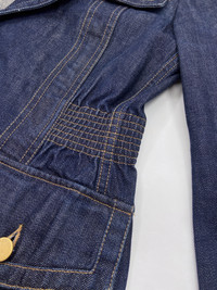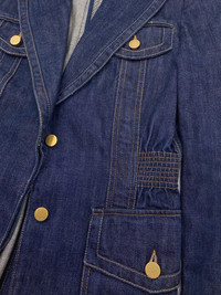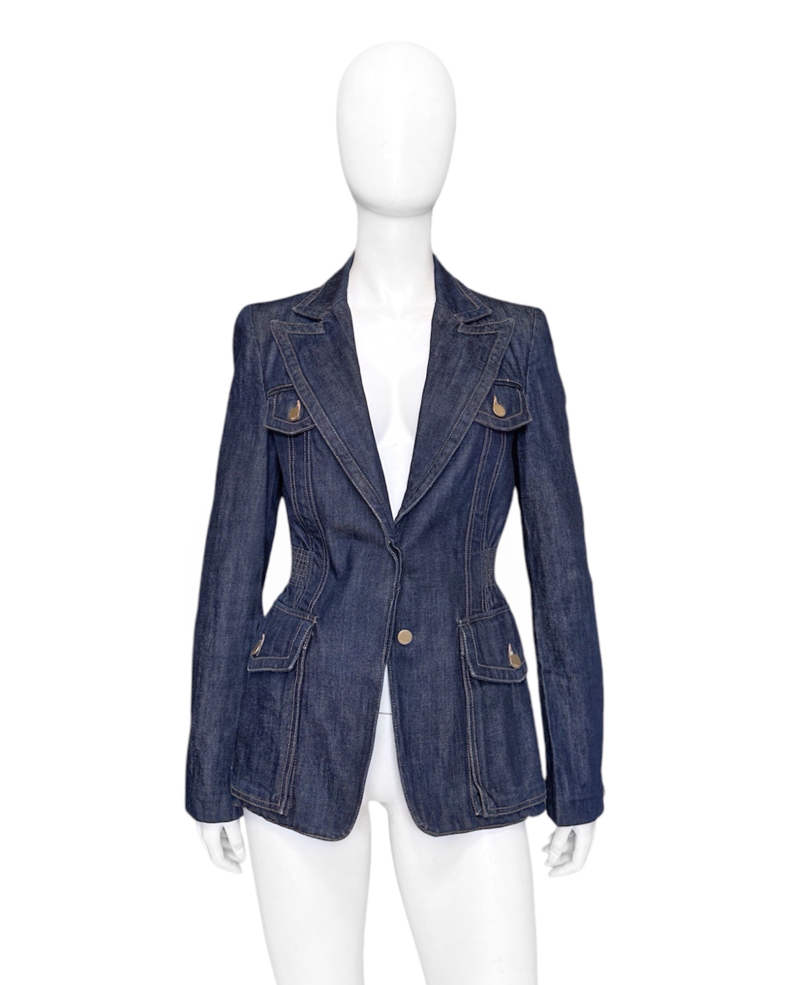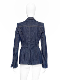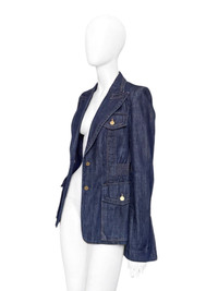 Gucci Fall 2003 Tom Ford Blue Denim Military Blazer Jacket 40 Size: 40 Shoulder: 15” Armpit to armpit: 17.5” Length: 27” Sleeves: 26.5” Measurements are measured on one side with garments laid flat (Waists and Hips are doubled) and are provided as a courtesy only- not a guarantee of fit. Mannequin is 33”, 24”,36” for reference Notes: From one of the most iconic collection designed by the one and only Tom Ford for his Fall 2003 Gucci Colleciton A denim military blazer with four pockets and cinched waist, peak lapels and gold hardware buttons The jacket is unlined and equipped with subtle shoulder pads Made in Italy Composition: 100% Cotton Condition: 4/5 (Mint condition, little to no signs of use) Defects: N/A Price(including shipping): $400