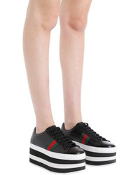 Gucci Peggy rainbow black platform ace sneaker 37 Sz:37 Perhaps one of the best designs to come out of Alessandro Michele’s Era for the house. Platform heels with stripes pattern. Green and red strip motif of Gucci. In mint condition. Some discolouration and signs of use.