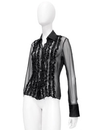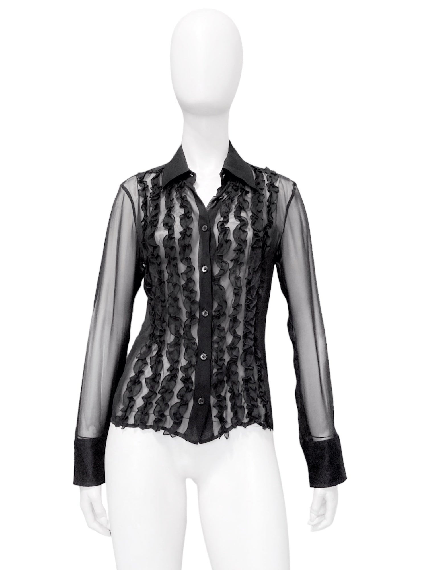 Gucci Spring 1999 Tom Ford Daisey Fuentes Ruffled Silk Sheer Dress Shirt 40 Size: 40 Shoulder: 16.5” Armpit to armpit: 19.5” Length: 23” Sleeves: 24” Measurements are measured on one side with garments laid flat (Waists and Hips are doubled) and are provided as a courtesy only- not a guarantee of fit. Notes: From Spring 1999 Gucci collection , designed by the one and only Tom Ford Although not making an appearance on the runway, it did appear in the ABSOLUT GUCCI party worn by Daisey Fuentes Minimal button-up shirt with ruffled silk accents at the front Made in Italy Composition: 100% Silk Condition: 4/5 (Mint condition, little to no signs of use) Defects: Material tag was removed Price(including shipping): $400