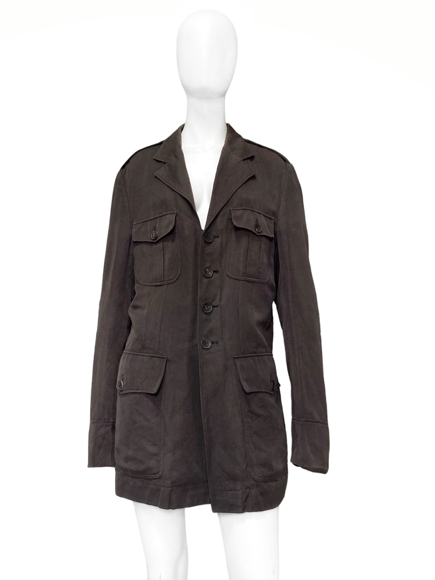 Gucci Spring 2003 Tom Ford Brown Military Jacket Coat 52 Size: 52 Shoulder: 20” Armpit to armpit: 22” Length: 33” Sleeves: 28” Measurements are measured on one side with garments laid flat (Waists and Hips are doubled) and are provided as a courtesy only- not a guarantee of fit. Notes: From the esteemed Spring 2003 Menswear Gucci Collection designed by the one and only Tom Ford A great spring summer piece, with four outer pockets and inner chest pocket Four button closure The coat has a fantastic wash and vintage look Made in Italy Composition: 100% Cotton Condition: 4/5 (Mint condition, little to no signs of use) Defects: Slight discolouration on the right lapel, not significant Price(including shipping): $500
