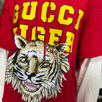 Gucci tiger red cut sleeve hoodie Sz:S A eye catching piece for all. Gucci tiger print with cut sleeves, basically an everyday hoodie. Size s oversized. Mint condition except two minor stains on the sleeves, which should be able to be cleaned off. Measurements: Shoulders:21” Chest:23” LEngth:24” sleeves:23”