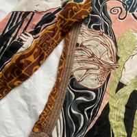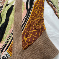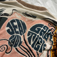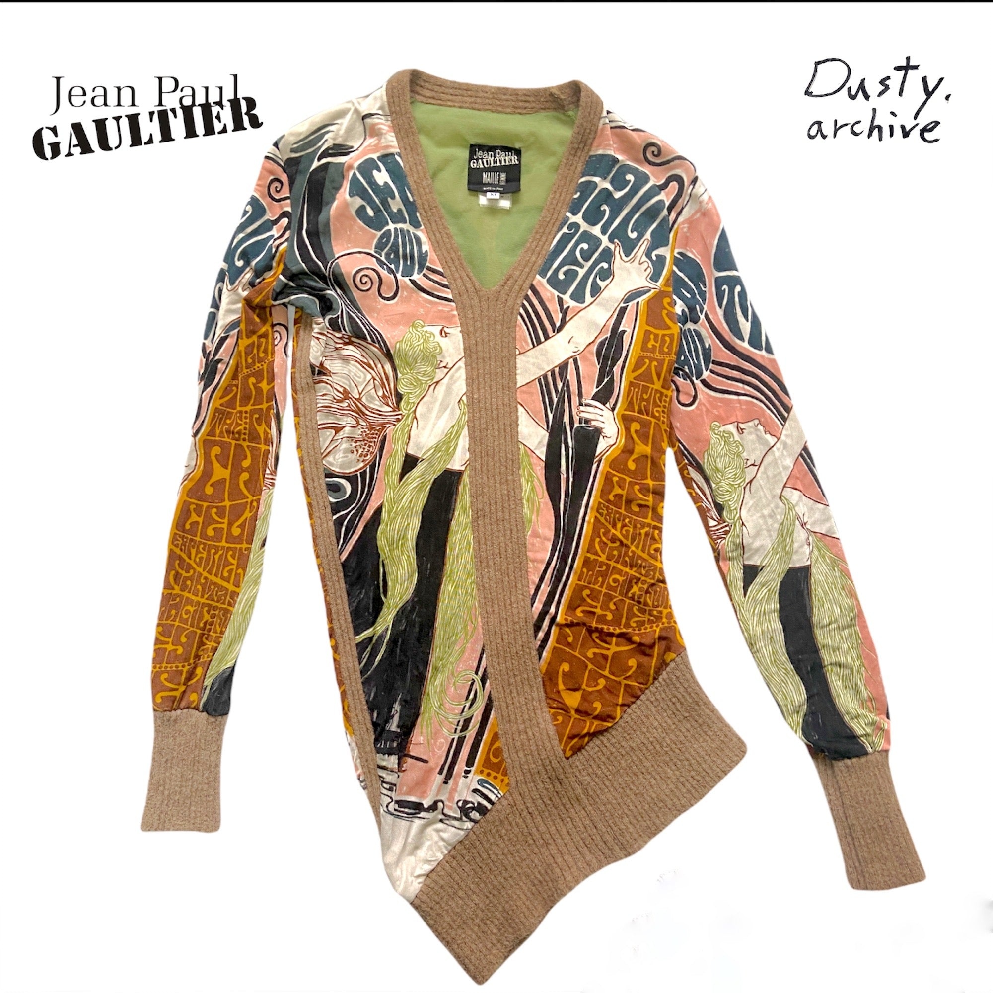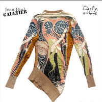 Jean Paul Gaultier Demetrius wool mesh sweater yr:1990s sz:m Lovely piece from the 90s. Asymmetrical cut, double layered mesh. ''Demeter' Greek goddess of agricultural print with jean Paul Gaultier logo around. Mint condition, no rips or tears. measurements: shoulders: 15" chest:16" length:27" sleeves:25"