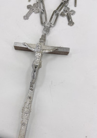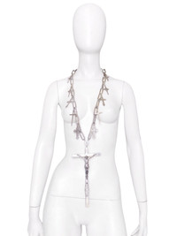Jean Paul Gaultier 90S Sample 1/1 XXL Silver 11 Crucifix Cross Chain Necklace Pendant length: 8.5” Pendant width: 4.3” Strap length: 41” Notes: From the l’enfant terrible, Jean Paul Gaultier’s 90s era, (I believe its fall 1994, but unsure) one of the highly sought after sample necklaces that are some of the most experimental and extreme jewellery out there Presumably made by Gaultier himself and his team, experimenting and fusing different styles and parts, constructing them by hand and usually finished with a layer of metallic airbrush paint Composed of a giant crucifix with hand carved Jesus sculpture and a scroll carved with “INRI”, five sets totalling 10 crucifix crosses that are symmetrically matched on each side, and a heavy-weight metal chain Notably the necklace is laid flat and airbrushed, giving the piece a antique look with uneven finish with some parts of the necklace is still black Comes with a Jean Paul Gaultier branded paper bag that comes with purchases in the 90s The artisanal design process of this necklace embody the essence of craftsmanship and artistic expression. Please note that due to their handmade nature, each necklace may exhibit imperfections. Their unique qualities contribute to the beauty and history of the individual piece. Slight irregularities or minor flaws may be present, there might be subtle peelings, oxidisation, or scratches. Materials used in the creation of these necklaces may showcase unpredictable characteristics. Color accuracy may vary on your screen/monitor, despite our efforts to display product colours as accurately as possible. Actual colour depends on the item. Please inspect the provided pictures carefully before you purchase Condition: 4/5 (Mint condition, little to no signs of use) Price(including shipping): $3000