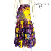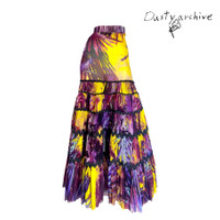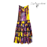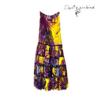 Jean paul gaultier rainforest print mesh tube dress / skirt Yr:2010s Sz:S A breathtaking dress for this summer! A rainforest yellow and purple print, perfectly draped with the patterns. Can be worn as a tube dress or a skirt. Made with high quality polyamide nylon fabric generously, double- mesh creating a form fitting yet fully breathable and comfortable. Super large spread. Between prints are bits of spandex that highlights and holds the dress together. In perfect condition, no wears or tears. Aside from double layered mesh theres an extra layer of black mesh on the inside that acts as lining for the whole dress. Size tag S and fits small to medium. Chest: 27-30" Length:37"