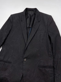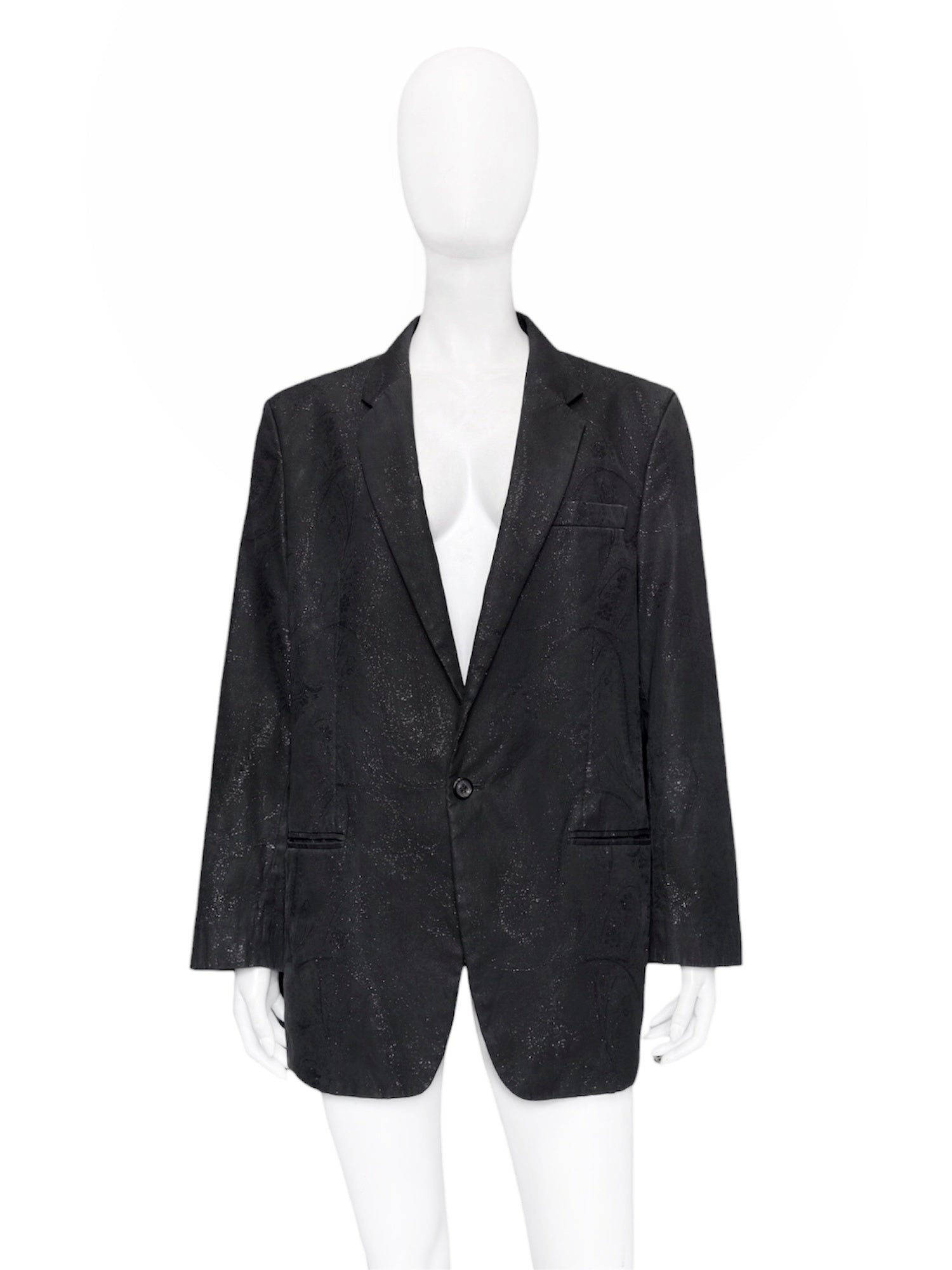 Maison Martin Margiela Spring 2006 Black Floral Lame Cotton Blazer 50 Size: 50 Shoulder: 18” Armpit to armpit: 23” Length: 31” Sleeves: 24.5” Measurements are measured on one side with garments laid flat unstretched (Waists and Hips are doubled) and are provided as a courtesy only- not a guarantee of fit. Mannequin is 33”, 24”,36” for reference Notes: From Spring 2006 Maison Martin Margiela Menswear collection Made from a cotton blend fabric with silver lame floral pattern with a single button design Special detail the first buttonhole on the cuffs are unopened Half lined with acetate, sleeves are also fully lined Signature number label with washing instruction tag Two outer pocket, two inner breast pockets and double vent Made in Italy Composition: 91% Cotton + 7% Cupro + 2% Polyester Lining: 100% Acetate Condition: 3.5/5 (Great condition, minor signs of use) Defects: Minor stains spots on right chest and right sleeve, there is also a pin hole on the left lapel We have to the best of our ability showcase all the defects, please inspect carefully before you purchase Price(including shipping): $450
