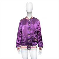 Hysteric glamour ‘75 super fuzz rayon varsity bomber jacket Sz:m A beautiful bomber jacket in a stunningly violet colour. Front and back embroidery, great for all seasons, two front pockets, reflective soft rayon material. Quilted lining. Perfect condition Measurements: Shoulders:17.5” Chest:22” Length:26” Sleeves: 24”