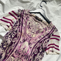 Roberto cavalli mesh print dress Sz:40 A beautiful dress for any occasion. Very eye catching purple print. Theres some yellow stain on each sleeve and on the chest shown on the third pic. Measurements: Shoulders:15” Chest:17” Length:25” Sleeves;8