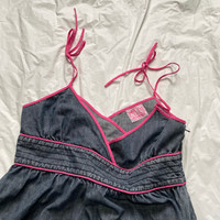 W< denim dress M A cute little dress with some colourful stitching detail and a pink lightening logo. Light denim material so can be worn for all seasons. Mint condition. Measurements: Chest:18” Length:32”