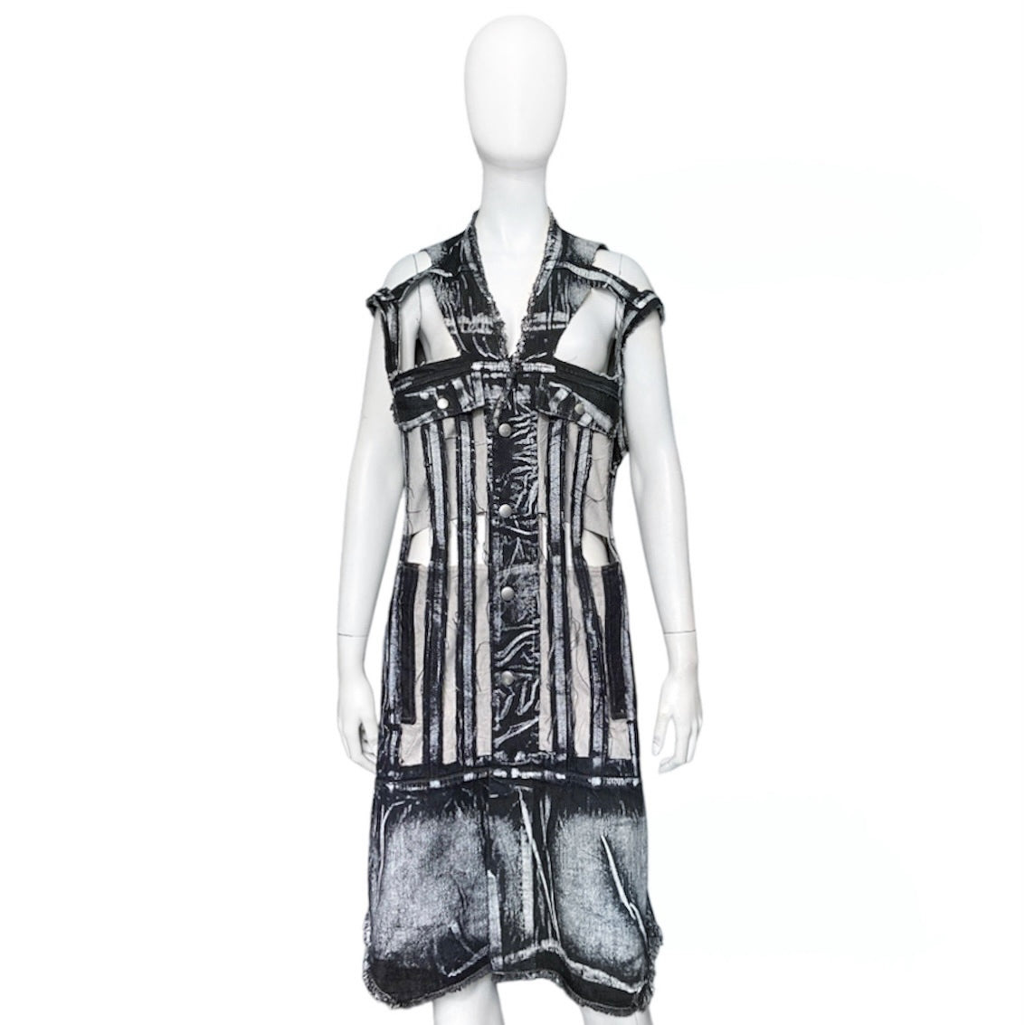 Rick owens Fall 2021 Gethsmane SL Trucker Liner caged destroyed painted black denim vest 48 Bwnt Yr:fw2021 GETHSMANE sz:48 Absolutely crazy piece from Rick Owens fall 2021 Gethsmane runway. A destroyed strip to bones vest with most of oit fabric cut to create this bombastic caged silhouette. Hand distressed with cut off style edges. Brand new never used with tags. Measurements: Shoulders:20” Chest: 21” length:42”