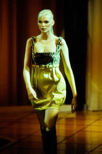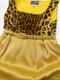 Gianni Versace Fall 1994 Faux Leopard Fur Mini Dress 38 Size: 38 Armpit to armpit: 15” Length: 34” Waist: 28” Belt: Total length: 32” Measurements are measured on one side with garments laid flat unstretched (Waists and Hips are doubled) and are provided as a courtesy only- not a guarantee of fit. Mannequin is 33”, 24”,36” for reference Notes: A stunning dress from Gianni Versace’s Fall 1994 RTW collection, modelled by Nadja Auermann for the 31st look on the runway The upper is a cotton viscose blend faux fur with leopard print, the skirt is made from a silk viscose wool blend with a shift dress silhouette We are very lucky to secure this dress with its very rare original matching belt that was featured on the runway look, the dress is equipped with belt hoops that allow the external belt to be fastened at External pockets with large Medusa branded buttons Pleated back design for a more relaxed fit Three slots for fastening the belt, suitable for sizes 27”, 28”, 29” The left shoulder can be opened for ease of putting on along with its side zip closure Fully lined with rayon Made in Italy Composition: 37% Cotton + 30% Silk + 28% Viscose + 5% Wool Lining: 100% Rayon Condition: 3.5/5 (Great condition, minor signs of use) Defects: There is a small stain under the belt, there is also a stain on the lining of the back, there is minor fraying between the seams of the right pocket, there is a mark on the back of the belt, some of the stitchings have become undone from the lining at the hem, the washtag was also cut We have to the best of our ability showcase all the defects, please inspect carefully before you purchase Price(including shipping): $1200