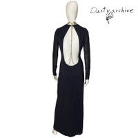 Versace plunging open back dress evening gown with gold crystal necklace and back chains Sz:38 A stunningly beautiful dress from versace, featuring a deep v neck cut and a plunging open back decorated with a layered gold crystal necklace and extended chains that dangle loosely. Soft viscose that wraps around the body comfy, nylon sleeves, and acetate silk mix lining that is literally the only material you should trust to put near you skin. Also with a front slit that cuts from ankle to just below the waistband. Zips on the back, side and both cuffs. Relax on the waist as they were meant to leave room. Fantastic condition, only flaw is a tiny hole on the left upper arm, that is mendable by a seeming it and itll be good as new. Measurements: Shoulders:14” Chest:34” Waist:32” Hip:32” Length:58” Sleeves:28” Measurements are provided as a gesture of courtesy and do not guarantee fit