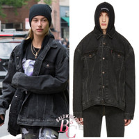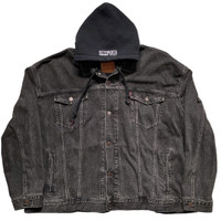 Vetements X Levis black denim oversized denim jacket with hood Yr:ss17 Sz:L Another iconic jacket from the iconic Vetements spring summer 2017 runway in black colourway. As seen on hailey and kanye. Extremely extremely oversized, rare size L thats makes it even more bigger. Designed to hang off the shoulders. With hood. Side pockets and inner pockets. Subtle greatness. Measurements: Shoulders:29” Chest:33” Length:29” Sleeves:25” 1.4k