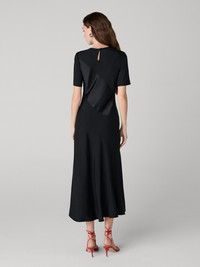 - Round neckline - Short sleeve - Flattering bias-cut - Pleated skirt - Ruffle leg slit - Midi length Size & Fit Olivia is 5'10.5" and is wearing a size 2 Fabric & Care With a silky surface and sultry drape, Stretch Satin is ultra effortless, balancing softness and stretch. 53% Viscose 44% Rayon 3% Spandex