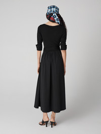 Ballerina silhouettes have always inspired Diane's designs. In a smooth matte jersey, this piece is made for movement - from work days to dancing nights. - V-neckline - Three-quarter cuffed sleeves - Self-tie wrap closure - Pockets - A-line skirt - Midi length - To wrap, loop the tie through the inside of dress Size & Fit Keny is 5'10" and wearing a size XS Fabric & Care The upper half of this dress is our matte jersey fabric, a soft, substantial smooth jersey with a clean finish. The skirt is crafted from our soft, light natural cotton fabric that creates structured silhouettes. 100% Viscose Interlock / 98% Cotton 2% Spandex