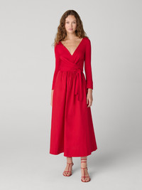 Ballerina silhouettes have always inspired Diane's designs. In a smooth matte jersey, this piece is made for movement - from work days to dancing nights. - V-neckline - Three-quarter cuffed sleeves - Self-tie wrap closure - Pockets - A-line skirt - Midi length - To wrap, loop the tie through the inside of dress Size & Fit Maia is 5'10" and is wearing a size XS Fabric & Care The upper half of this dress is our matte jersey fabric, a soft, substantial smooth jersey with a clean finish. The skirt is crafted from our soft, light natural cotton fabric that creates structured silhouettes. 100% Viscose Interlock / 98% Cotton 2% Spandex