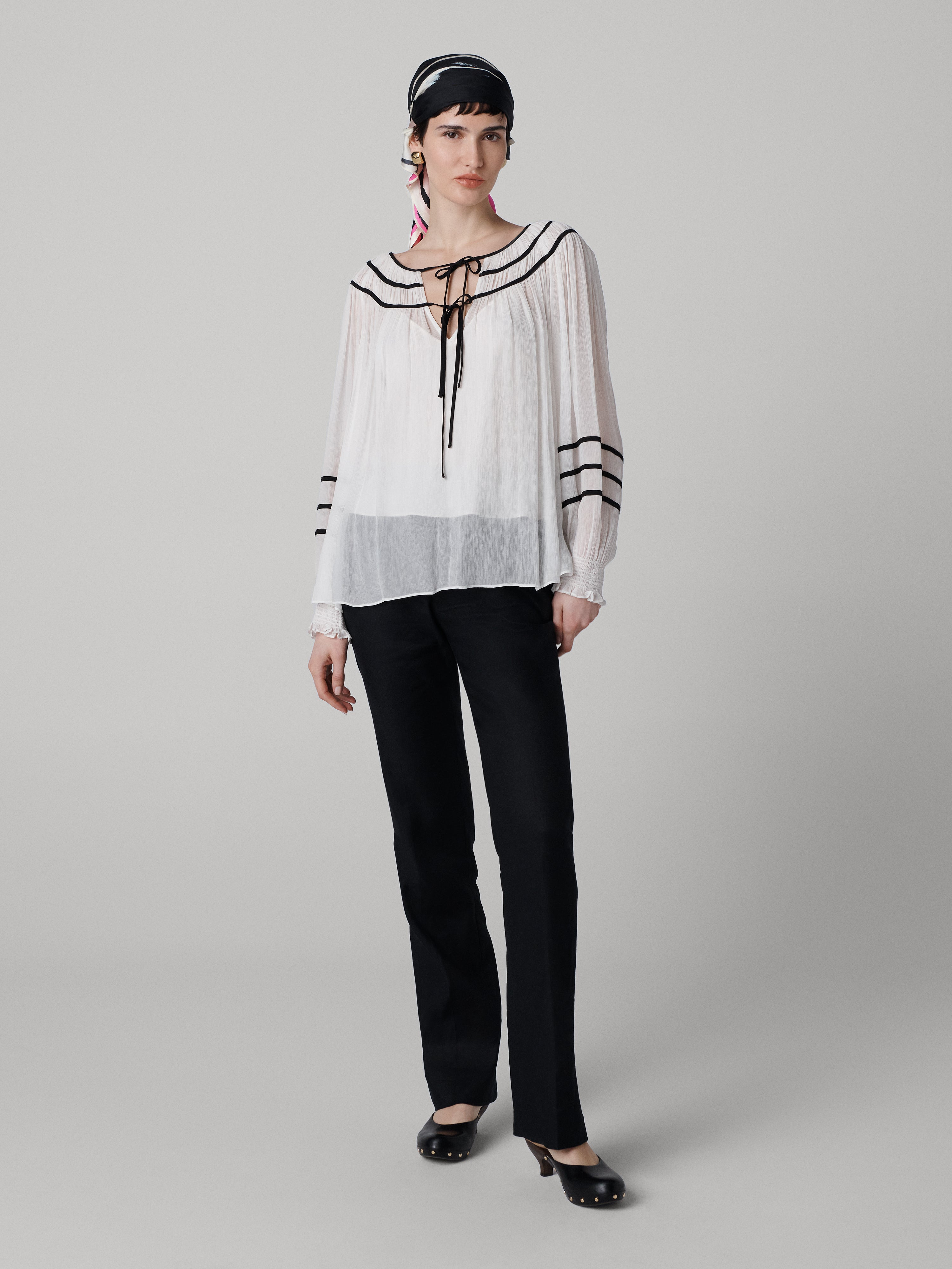 Cut from a textured chiffon, the Beverly Top is a blouse silhouette with black contrasting trim and a multi-tie neckline. - Scoop neckline - Multi-tie neckline detail - Long billowy sleeves featuring contrasting trim - Easy shape Size & Fit Tatia is 5'11" and is wearing a size XS Fabric & Care A soft, light chiffon with a romantic drape and a textured feel. 100% Viscose