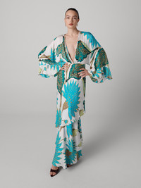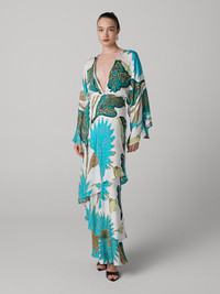 Cut from a soft silk georgette, the Christine Maxi dress has a sultry, relaxed drape. - Deep V-neckline - Also has hook and eye closure for more chest coverage - Long wide relaxed sleeves - Easy shape - Asymmetrical ruffles - Maxi length Size & Fit Sasha is 5'10" and wearing a size XS Fabric & Care Silk Georgette is a ultra light and soft, this fabric has a delicate drape and a romantic feel. 95% Silk 5% Spandex