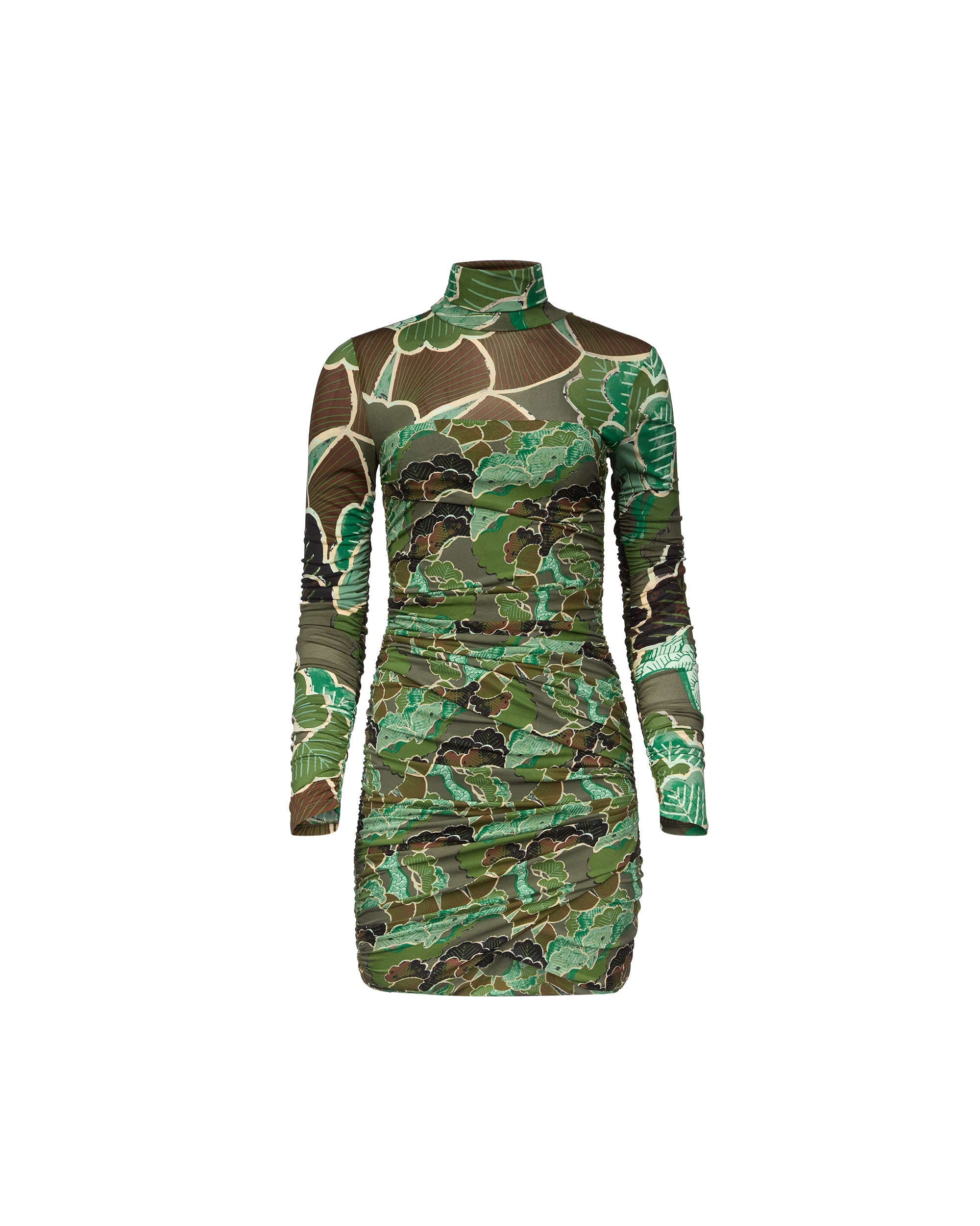 The Clarabella Dress is a sleek mini crafted from smooth jersey with a bold camo print for a modern, stylish look. - Mock neck - Long sleeves - Fitted throughout - Ruched bodice - Mini length Size & Fit Anais is 5'10" and is wearing a size XS Fabric & Care A soft, smooth jersey with a clean finish that takes well to bright, bold prints. 100% Viscose