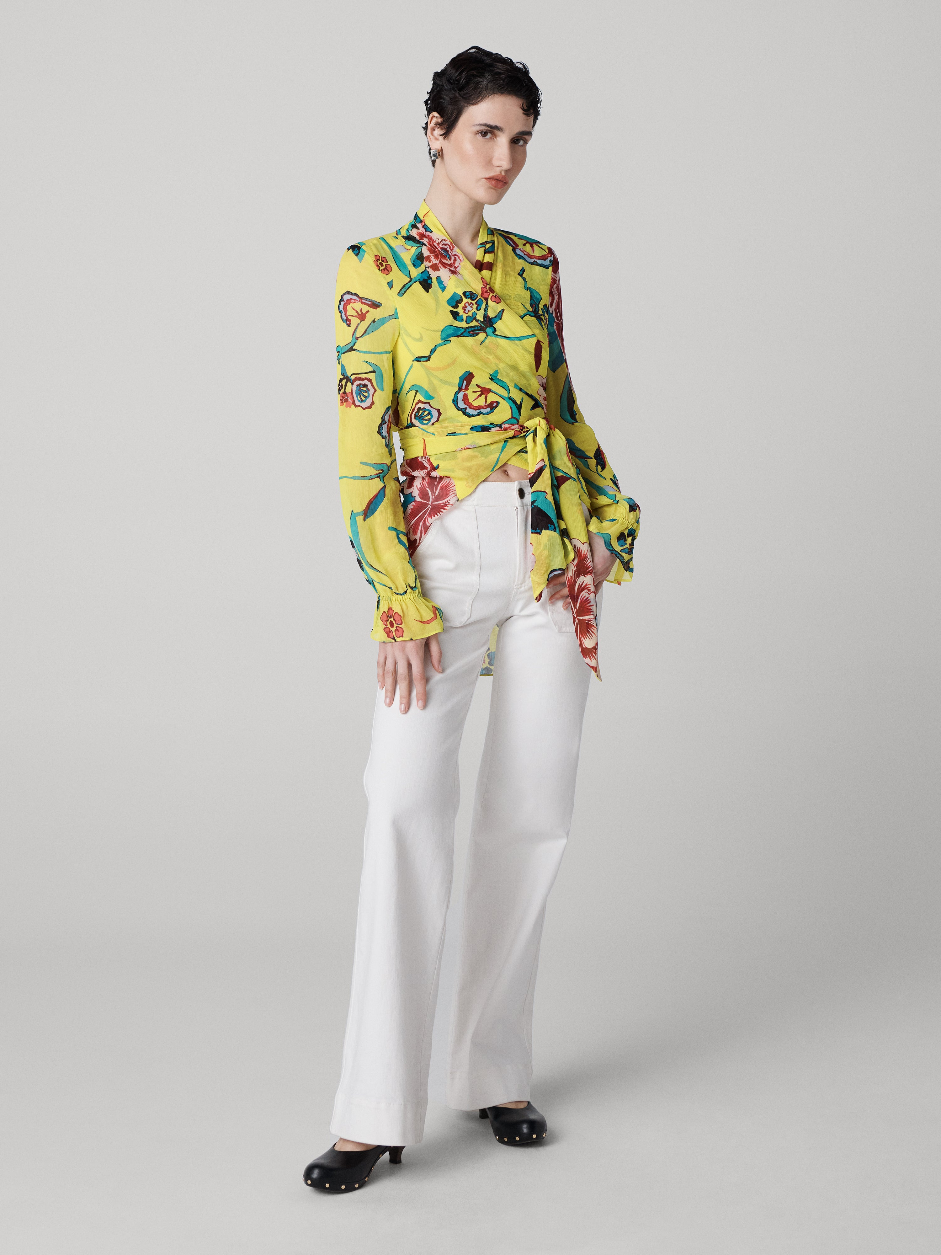Made from a textured chiffon, the Doris Wrap Top is a relaxed silhouette with a soft, textured feel. - V-neckline - Long sleeves with cinched wrists - True wrap closure - Waist cinching tie - Cropped length Size & Fit Tatia is 5'11" and is wearing a size 2 Fabric & Care A soft, light chiffon with a romantic drape and a textured feel. 100% Viscose