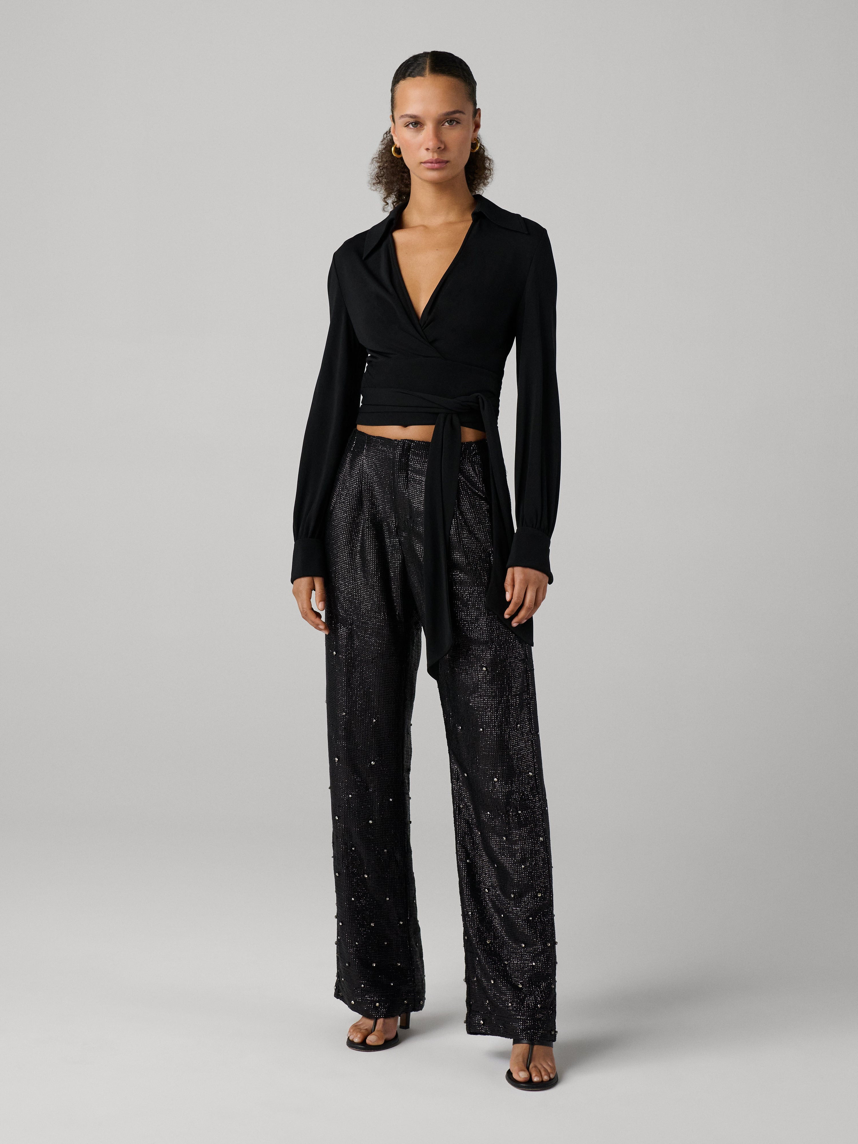 Make a statement in the Elton Trousers, featuring show-stopping all-over embellishments. - Mid rise - Elastic waist - Straight leg - Full length Size & Fit Ruby is 5'9" and is wearing a size 2 Fabric & Care Lightweight georgette detailed with delicate embellishments for added shine. 100% Polyester Dry Clean Only