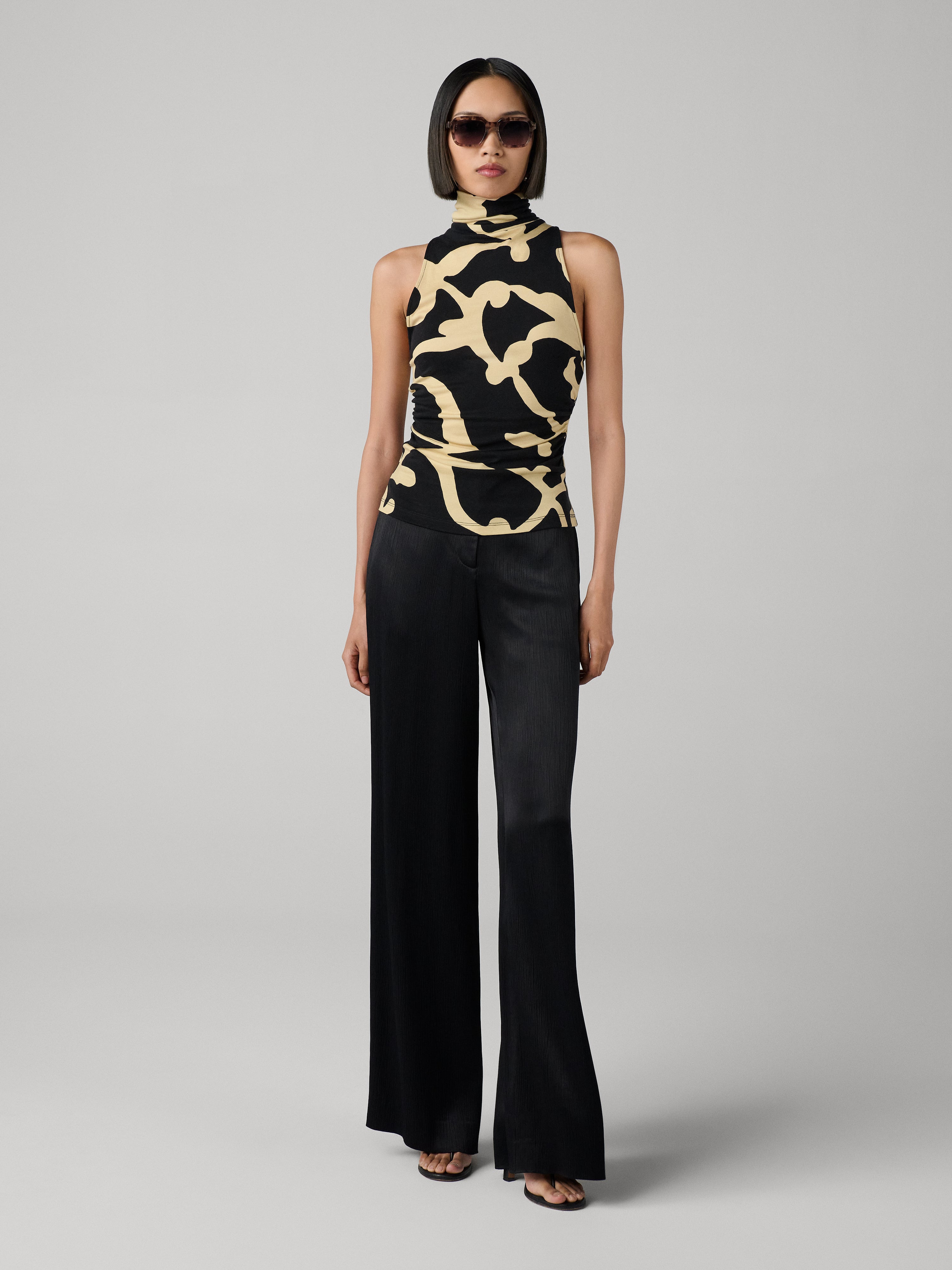 The Frances Top pairs soft fabric with a sleek, sleeveless turtleneck for understated, effortless allure. - Turtleneck - Sleeveless - Ruched bodice - Falls around the hips Size & Fit Anais is 5'10" and is wearing a size XS Fabric & Care Lightweight with a fluid drape and softly structured warmth. 72% Lyocell 28% Wool Dry Clean Only