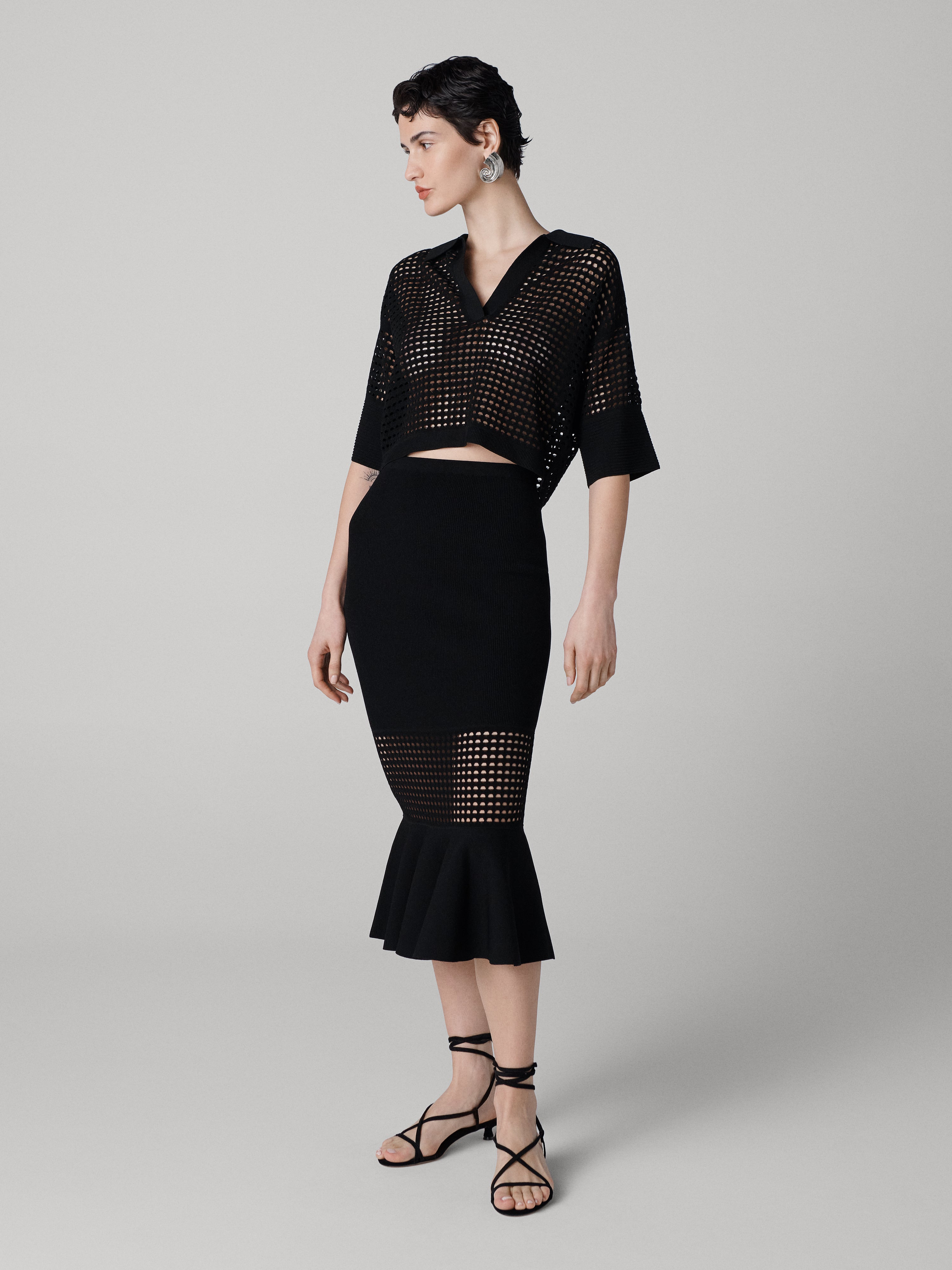 An eyelet knit piece, the Harper Polo brings sheerness to classic Polo details. - Classic collar - V-neckline - Contrasting trim - Wide half sleeves - Cropped length Size & Fit Tatia is 5'11" and is wearing a size XS Fabric & Care This luxurious viscose blend is a soft and breathable fabric with slight stretch. 100% Viscose blend