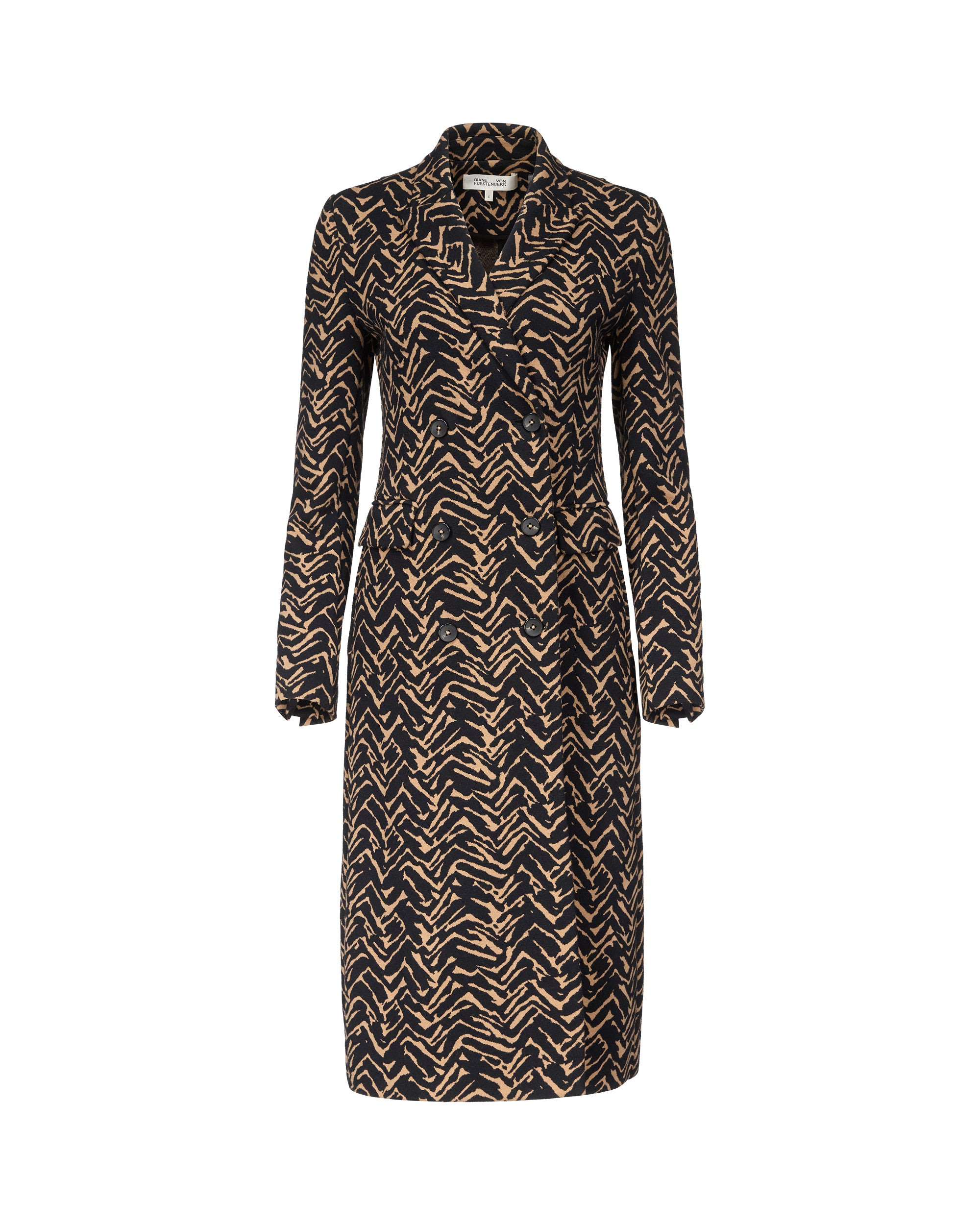The Ilana Coat is the ideal layer for cooler days, combining a sophisticated shape with a classic print. - Classic collar - Double-breasted closure - Long sleeves - Knee length - Can also be styled as a dress Size & Fit Beatriz is 5'11" and is wearing a size XS Fabric & Care A knit detailed with woven prints that give it a textured feel and an elevated look. 49.8% Polyester 47.6% Cotton 1.5% Spandex Dry Clean Only