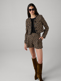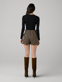 Our Kinsley Knit Short pairs a playful mini cut with refined pleats—perfect for fall. - High waisted fit - Mini length - Tailored pleats - Pockets - Pair with our Andrea Jacket Size & Fit Beatriz is 5'11" and is wearing a size XS Fabric & Care A knit detailed with woven prints that give it a textured feel and an elevated look. 49.8% Polyester 47.6% Cotton 1.5% Spandex Dry Clean Only