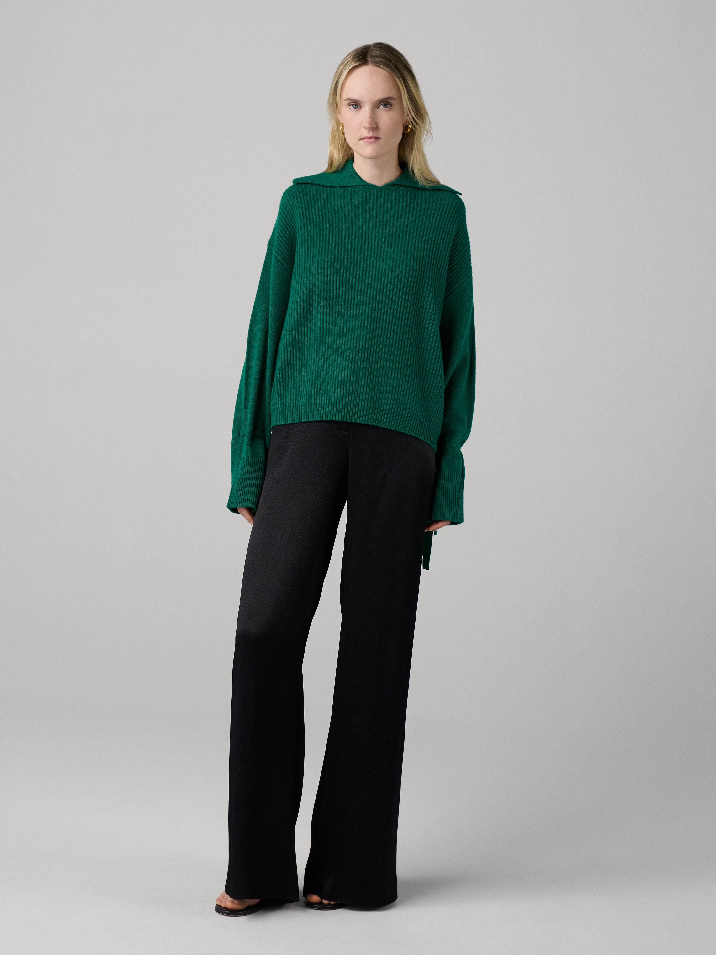 The Mara Sweater is soft and romantic, crafted from our signature cashmere-wool blend and finished with delicate sleeve ties. - Relaxed collar - Drop shoulder - Tie detail at wrist - Ribbed texture - Waist length Size & Fit Harleth is 5'10" and is wearing a size XS Fabric & Care A cashmere wool blend that is soft yet warm. 70% Wool 30% Cashmere Dry Clean Only