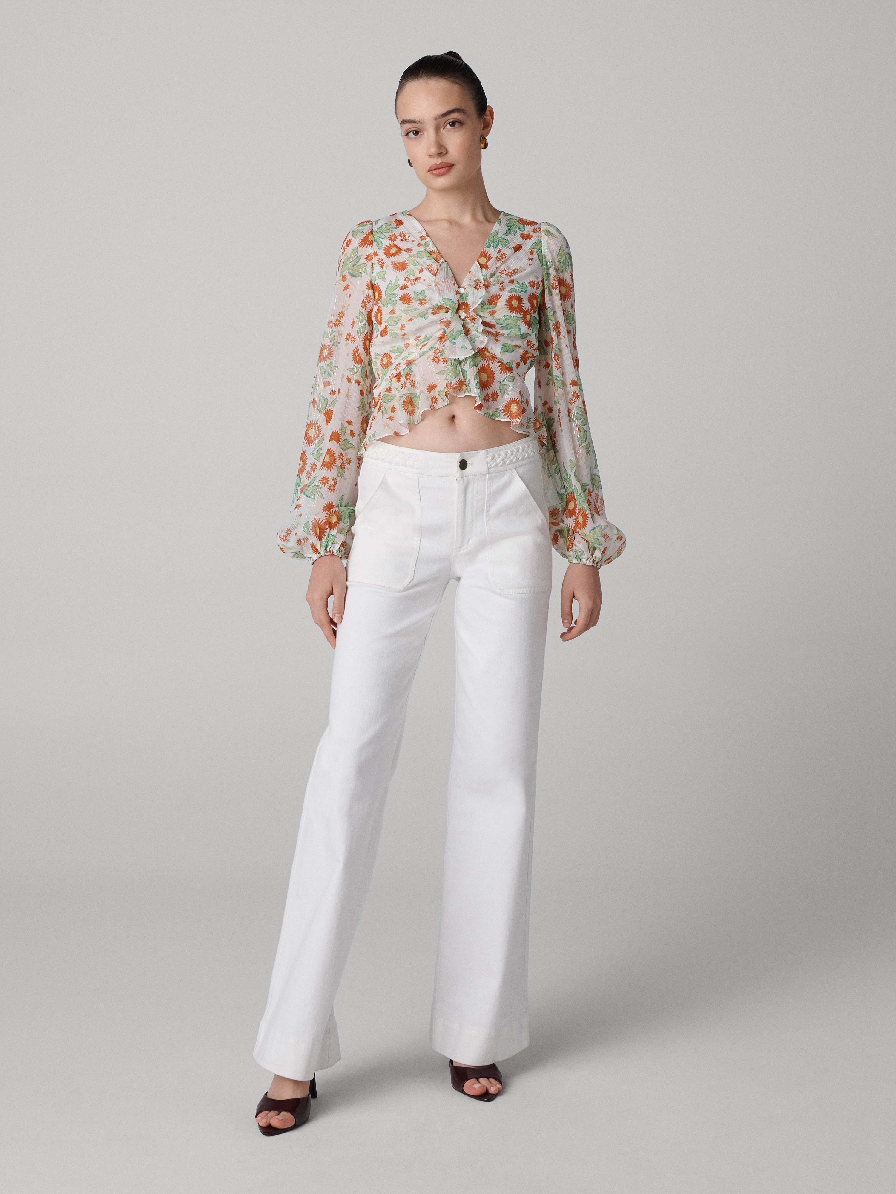 Cut from a silk-chiffon, the Mary Top has a soft, textured feel with a subtle sheen. - Silk Lurex Chiffon - Ruffled V-neckline - Centered knotted detail - Centered ruching - Long sleeves with cinched wrists - Cropped length Size & Fit Sasha is 5'10" and is wearing a size XS Fabric & Care Crafted from delicate silk lurex chiffon, this fabric offers a light, airy feel with a hint of shimmer. 93% Silk 7% Lurex