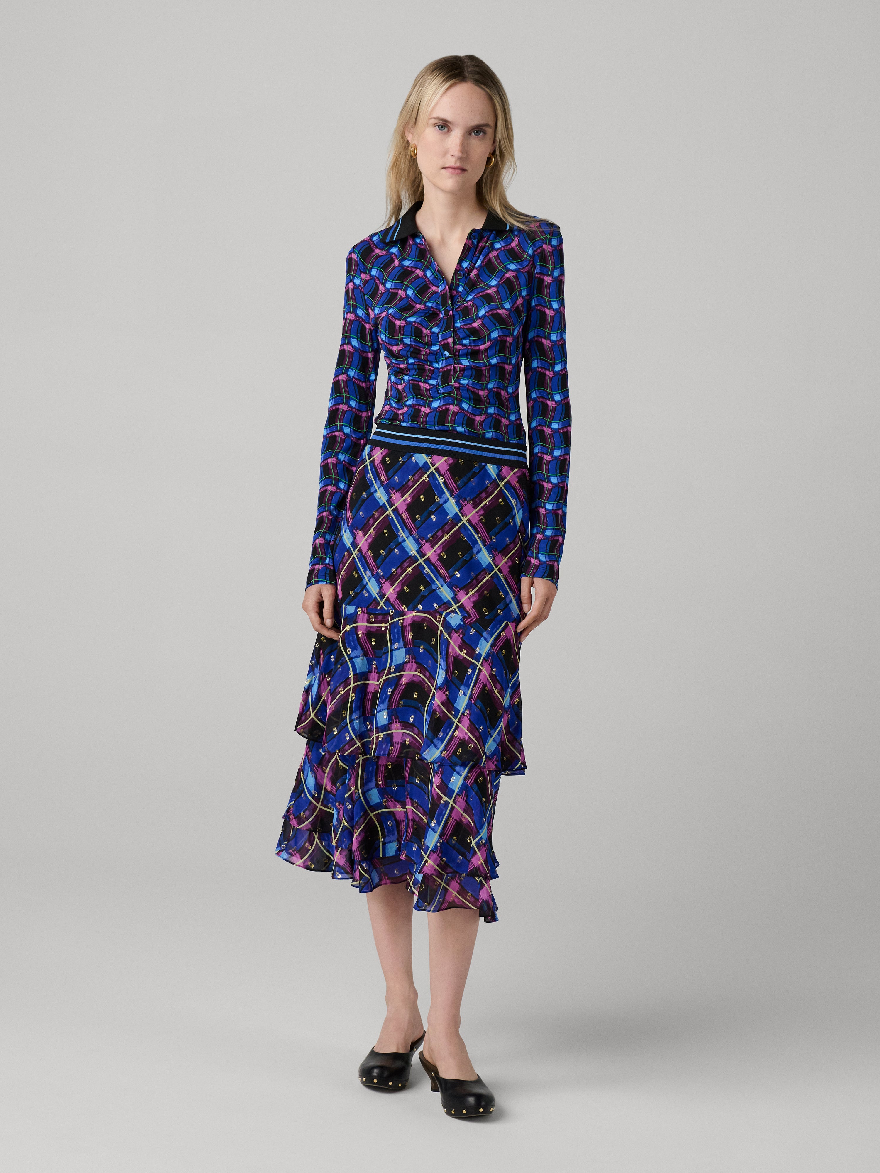 Our comfy and airy Meg Skirt flows in tiered layers, subtly infused with a metallic shimmer for refined radiance. - Wear mid or low rise - Elastic waist - Tiered, draped layers - Midi length Size & Fit Harleth is 5'10" and is wearing a size XS. If between sizes we recommend sizing up. Fabric & Care Light and romantic, this fabric features a refined metallic weave for a modern, elevated finish. 96% Viscose 4% Lurex Dry Clean Only