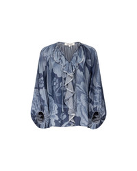 Crafted from a soft knit denim, the Nicky top has an effortlessly romantic feel. - V-neckline - Ruffle detail - Long billowy sleeves - Gathered sleeve - Easy shape - Tie at neckline Size & Fit Afra if 5'9" and is wearing a size XS Fabric & Care A lightweight soft semi-synthetic fabric that balances structure and fluidity, ideal for softly tailored silhouettes. 89.5% Lyocell 10.5% Acetate