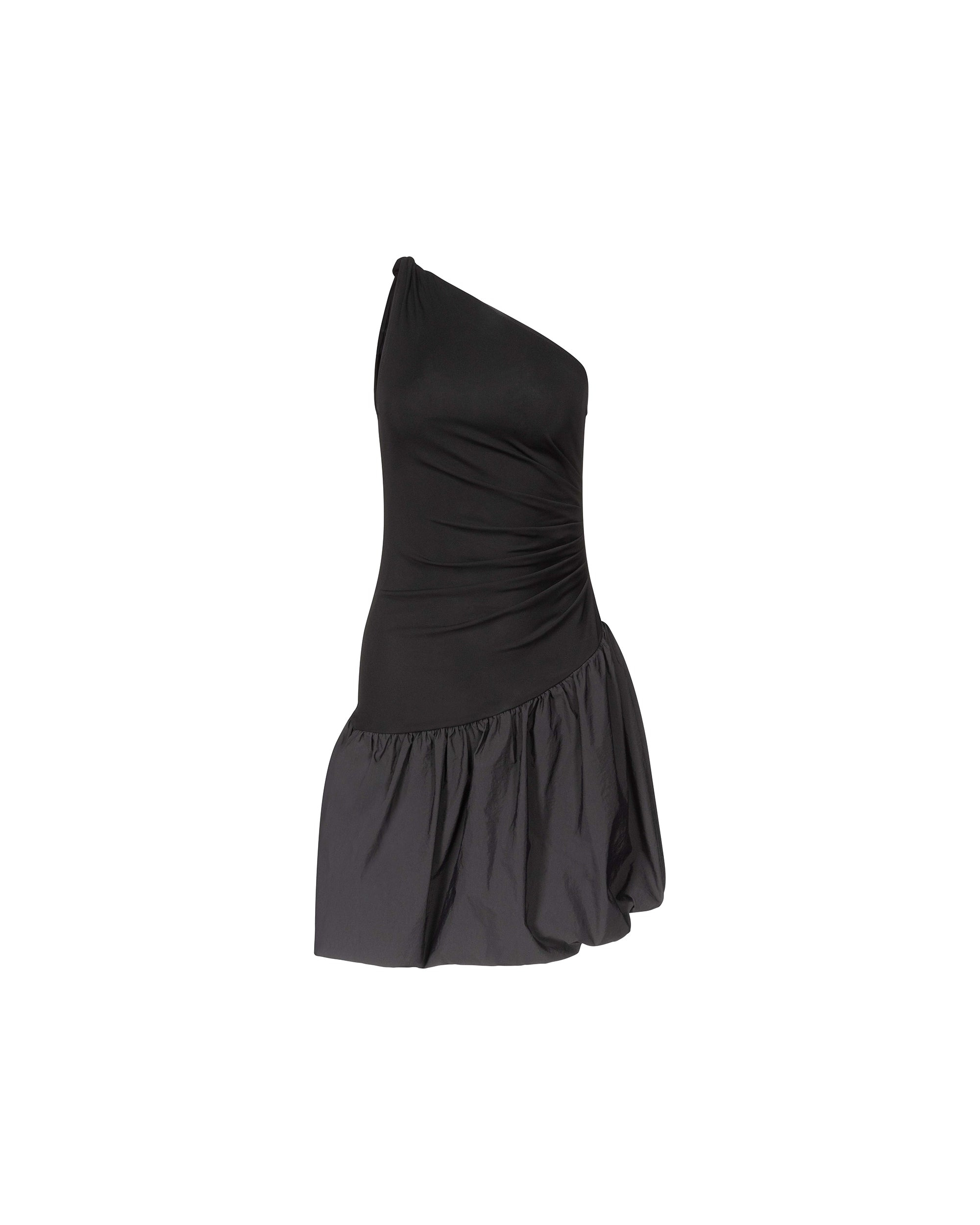 Combining matte jersey and taffeta, the Nina Mini Dress is a one-shoulder piece that balances a close fit with a structured silhouette. - Asymmetrical neckline - Twist detail on shoulder - Side ruched gathering - Drop waist - Close fit - Flared bubble-hem skirt - Mini length Size & Fit Afra is 5'9" and is wearing a size XS Fabric & Care Matte Jersey is a soft, smooth jersey with a clean finish that takes well to bright, bold prints. 100% Viscose