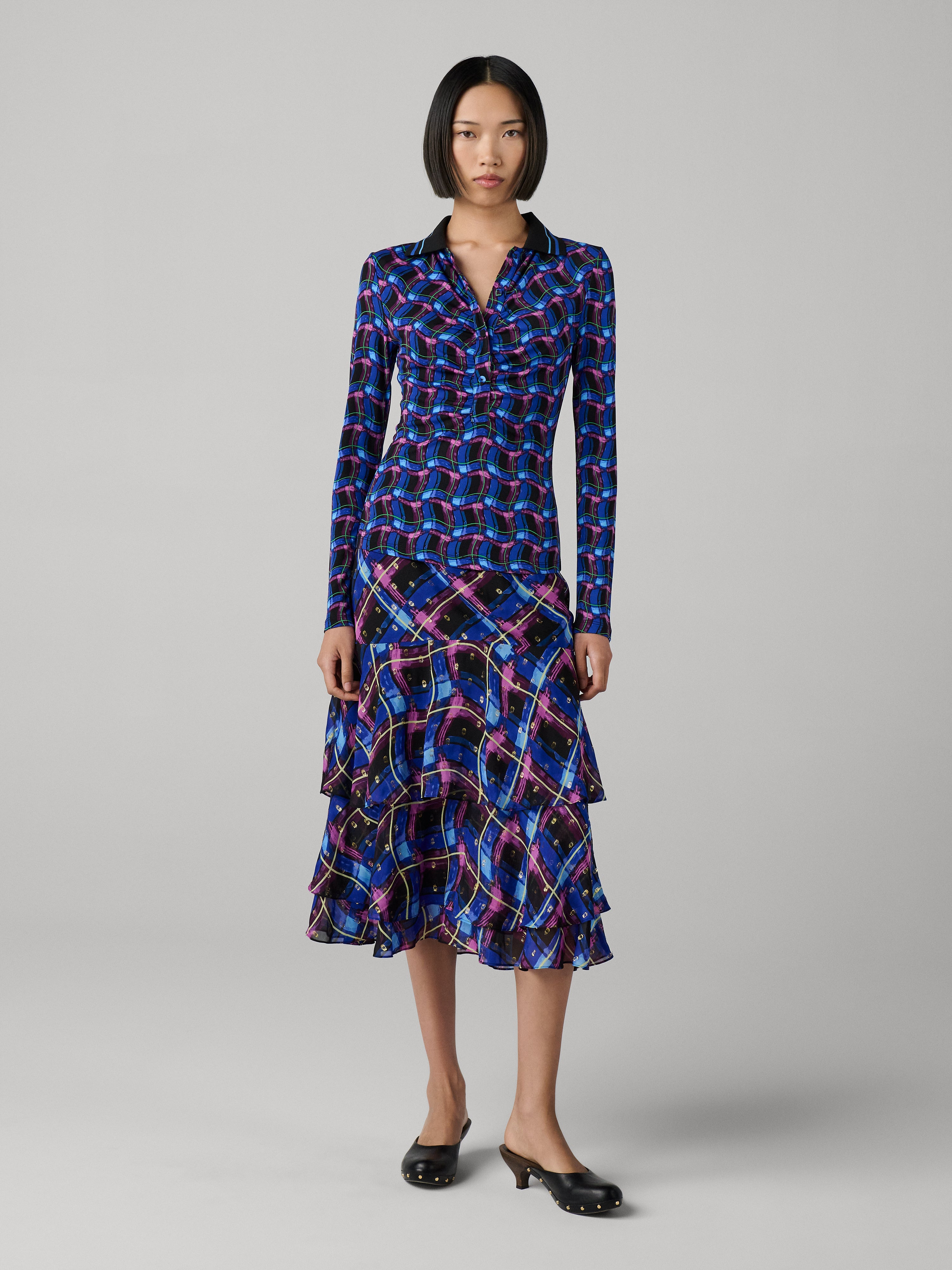 The Sheska Top brings the elegance of our signature dress silhouette to an everyday top, crafted in smooth matte jersey that moves with you. - Classic ribbed collar - Fitted long sleeves - Buttons down center - Ruched bodice Size & Fit Anais is 5'10" and is wearing a size XS Fabric & Care A soft, smooth jersey with a clean finish that takes well to bright, bold prints. 100% Viscose Dry Clean Only