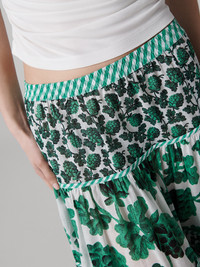 Crafted from a silk-cotton blend, the Shiloh Skirt features contrasting prints and has a light and luxurious drape. - 72% Cotton, 28% Silk - Low-rise fit - Contrasting prints - Full tiered skirt - Maxi length Size & Fit Tatia is 5'11" and is wearing a size XS Fabric & Care Ultra soft and light, this silk-cotton blend has a romantic, delicate drape. 72% Cotton 28% Silk