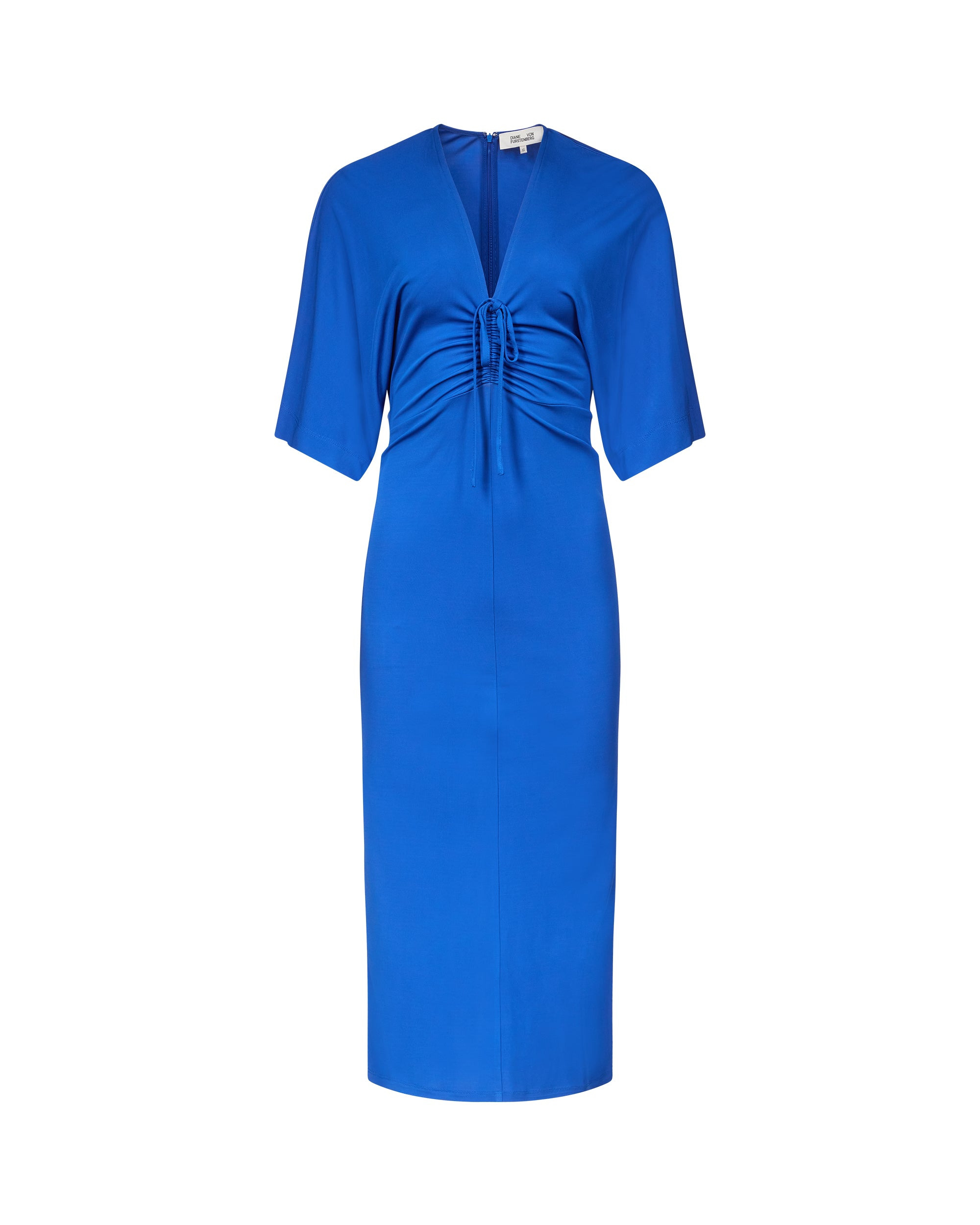 Sleek and simple, the Valerie is cut from a smooth, single-layer matte jersey - Wide relaxed short sleeves - V neckline - Falls around the knee - Cinched bust - Midi length Size & Fit Ruby is 5'9" and is wearing a size XS Fabric & Care A soft, smooth jersey with a clean finish that takes well to bright, bold prints. 100% Viscose Dry Clean Only