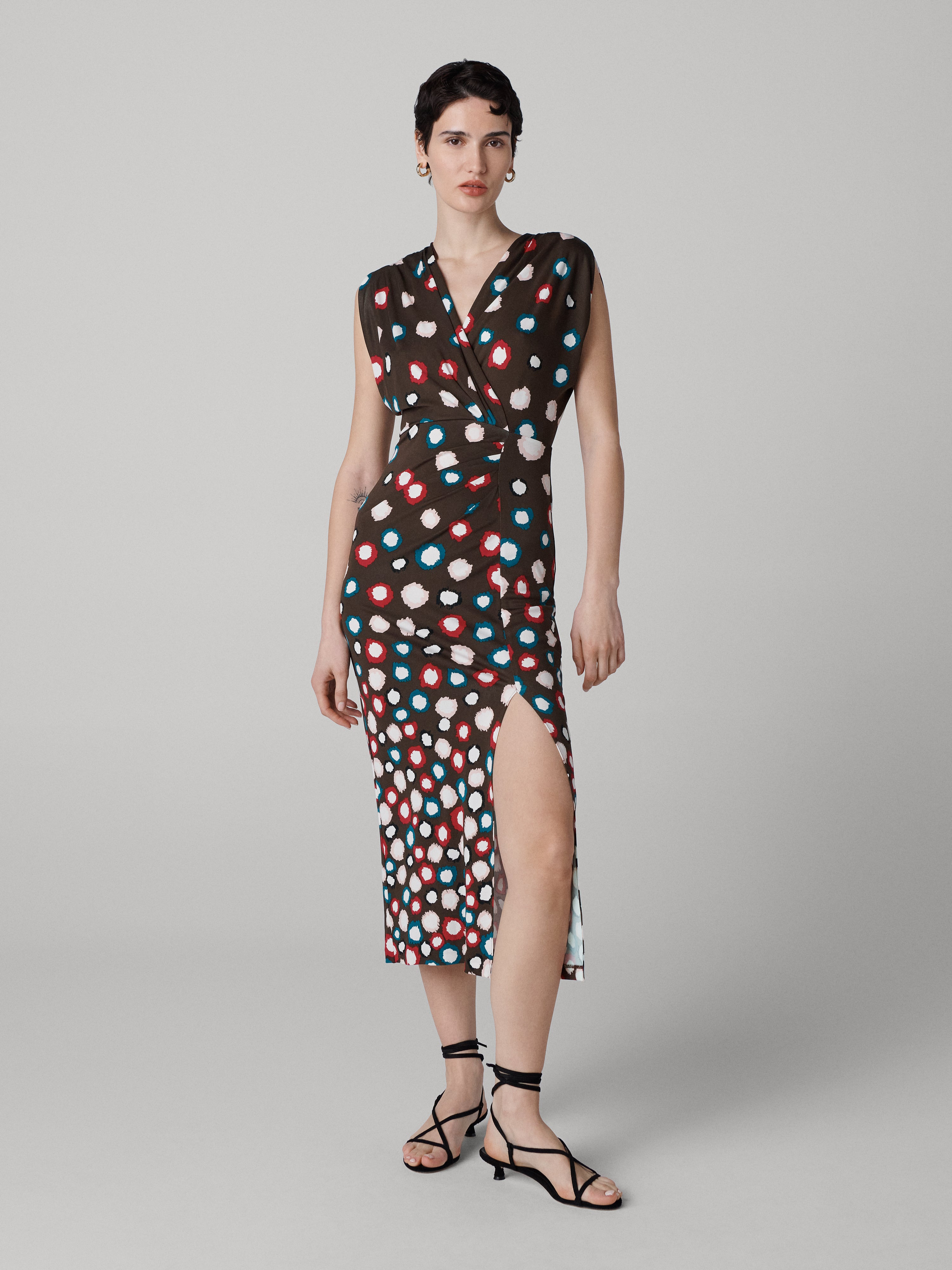 Made from matte jersey, the Williams Dress has a light, soft feel and a smooth finish. - V-neckline - Sleeveless - Wrap-style gathering - Cinched waist - Close fit - Single side slit - Midi length Size & Fit Tatia is 5'11" and is wearing a size XS Fabric & Care Matte Jersey is a soft, smooth jersey with a clean finish that takes well to bright, bold prints. 100% Viscose