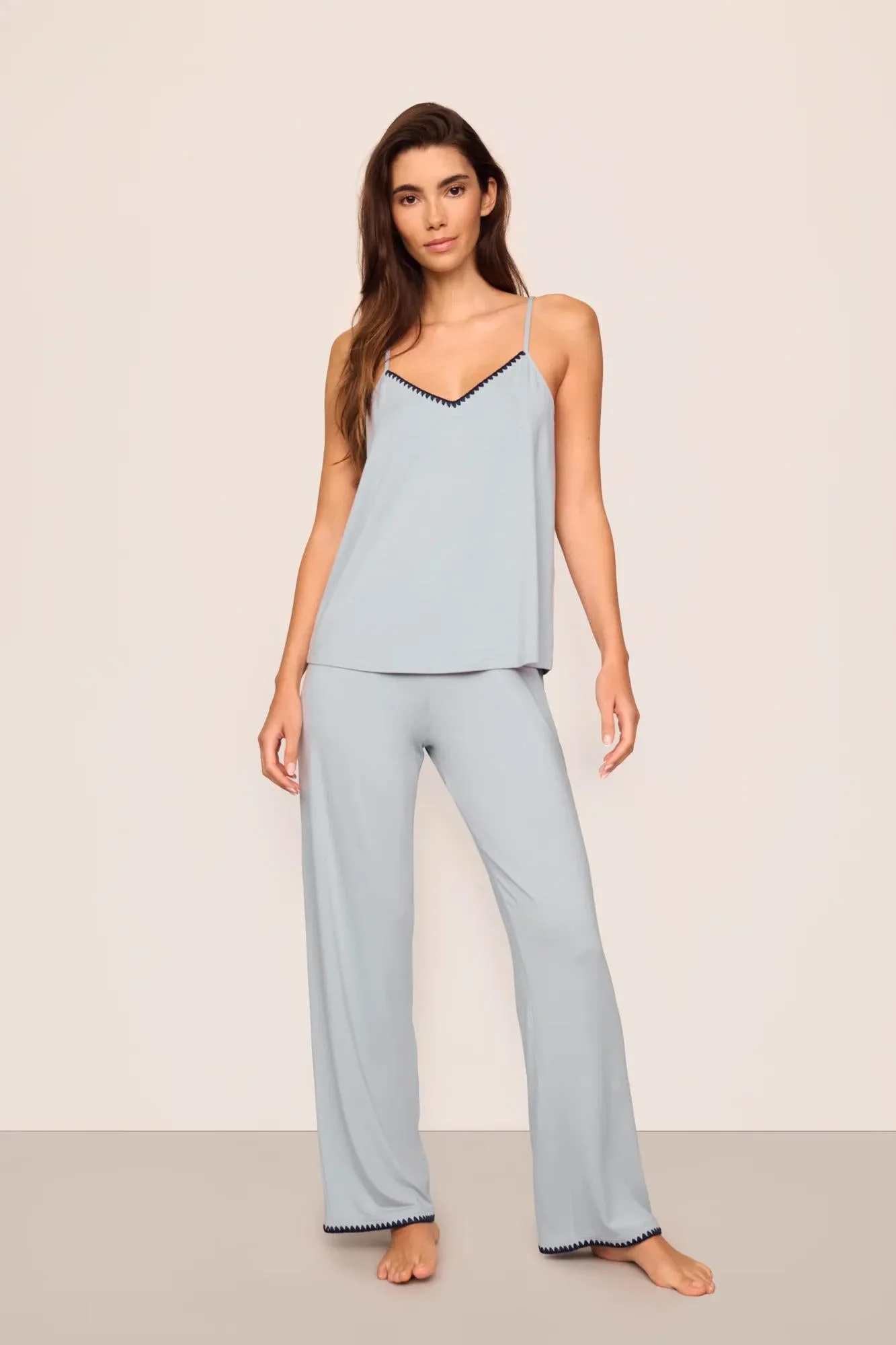 For the one who appreciates the details. Made from TENCEL™ Modal fibers and a touch of elastane, this buttery soft fabric is verified by OEKO-TEX® Standard 100, meaning it’s dyed with safe and non-toxic dyes. This set features a v-front and back cami top with a relaxed fit, artisanal whipstitch piping, and adjustable straps fit for your comfort. The mid-rise pant features an elastic waistband for your comfort. Pairs well with our Mia Bralette and Brazilian. Color: Gray Dawn/Navy DESIGN & FIT - V-neck front and back relaxed cami with adjustable straps - Low-rise straight leg pant with thin elastic waistband and contrast whipstitch detail - Classic Fit — true to size, comfortable for everyday wear FABRIC & CARE - Fabric: 95% TENCEL™ Modal, 5% Elastane — ultra-soft, breathable, and naturally drapes for all-day comfort. - Turn inside out before washing. Machine wash cold with like colors on a gentle cycle. Use only non-chlorine bleach when needed. Tumble dry low. Warm iron if necessary. - Imported.
