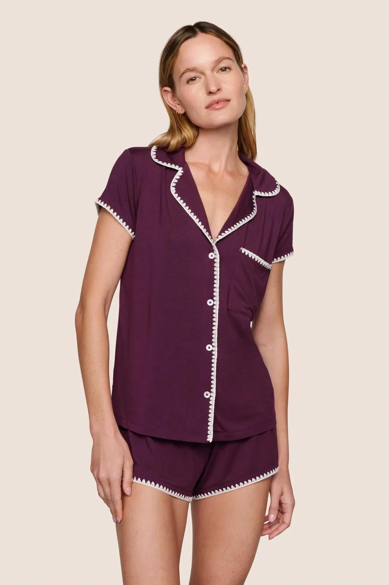 We took all the best features of our best-selling Gisele collection—the softness, the comfort, the temperature-regulating fabric—and added eye-catching artisanal whipstitch piping to both the top and bottom for a playful, Bohemian vibe. Made from TENCEL™ Modal fibers and a touch of spandex, this super soft fabric is verified by OEKO-TEX® Standard 100, meaning it’s dyed with safe and non-toxic dyes. This set has a classic slim fit short sleeve top and a low-rise cheeky short with an elastic waistband, so you can feel comfortable and stylish all at the same time. Pair Pima intimates underneath for breezy ZZZ’s. Color: Plum/Ivory DESIGN & FIT - 95% TENCEL™ Modal, 5% Spandex - Cheeky shorty set - Classic slim fit short sleeve top - Button front top with notch collar and functional pocket - Low-rise cheeky short with thin elastic waistband - Contrast whipstitch detail on both top and short - Machine wash cold; tumble dry low - Imported FABRIC & CARE - Fabric: 95% TENCEL™ Modal, 5% Elastane — ultra-soft, breathable, and naturally drapes for all-day comfort. - Turn inside out before washing. Machine wash cold with like colors on a gentle cycle. Use only non-chlorine bleach when needed. Tumble dry low. Warm iron if necessary. - Imported.