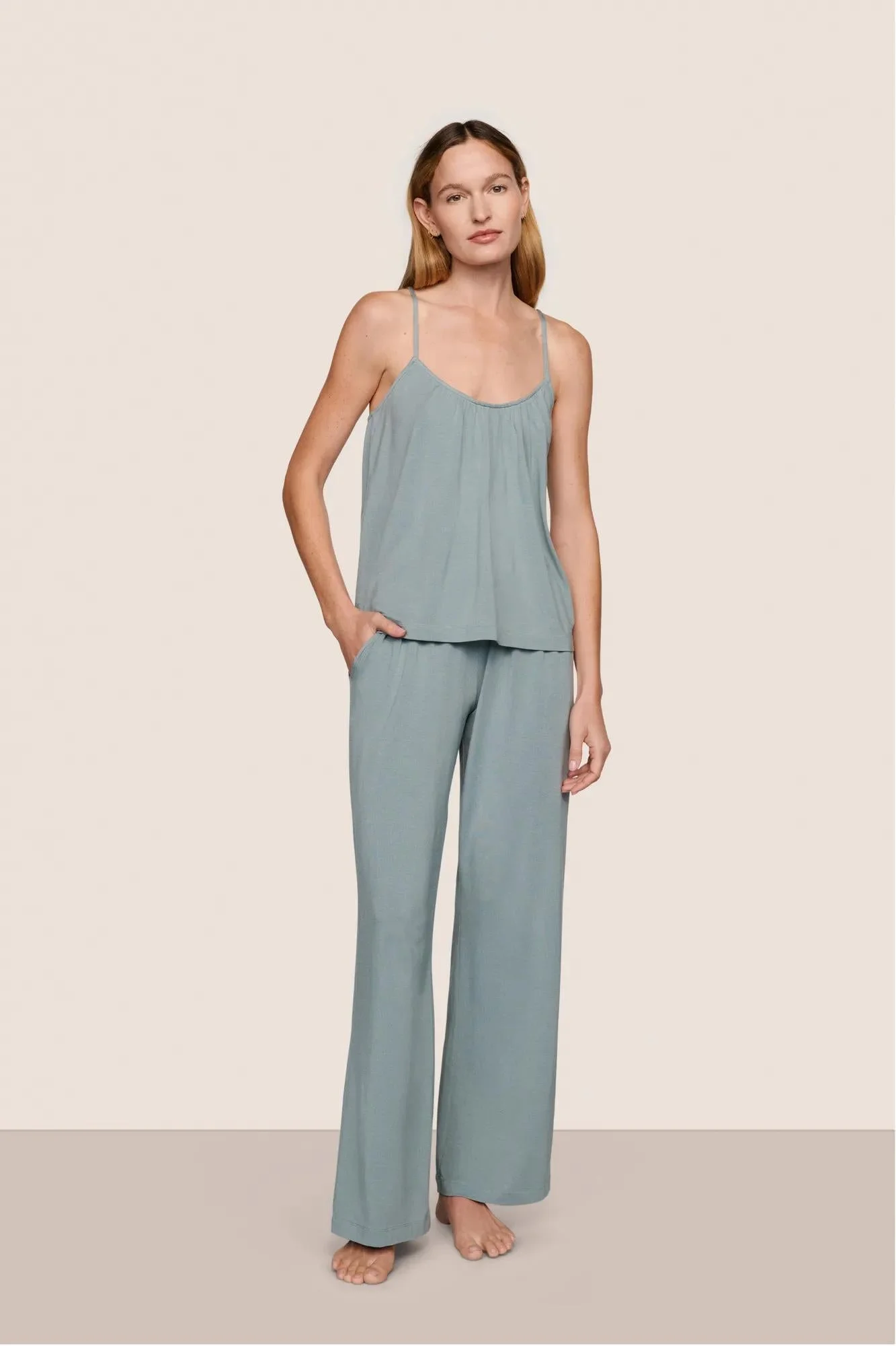 Cool on top, cozy on bottom. The cami features a flattering scoop neck with soft shirring at the center, adjustable straps fit for your comfort. The mid-rise straight leg pant boasts an elastic waistband with a drawstring, side pockets, and a flowy fit that drapes like a dream. This set is made from 95% TENCEL™ Modal and a touch of spandex, verified by OEKO-TEX® Standard 100, which means it was processed without harmful chemicals. Pair the cami and pant with our Gisele Long Robe or mix and match with your favorite Gisele PJ set or Slouchy pieces. Color: Lead DESIGN & FIT - Scoop-neck cami with soft shirring at neckline and adjustable straps - Mid-rise straight-leg pant with elastic waistband and side pockets - Classic Fit — true to size, comfortable for everyday wear FABRIC & CARE - Fabric: 95% TENCEL™ Modal, 5% Elastane — ultra-soft, breathable, and naturally drapes for all-day comfort. - Turn inside out before washing. Machine wash cold with like colors on a gentle cycle. Use only non-chlorine bleach when needed. Tumble dry low. Warm iron if necessary. - Imported.