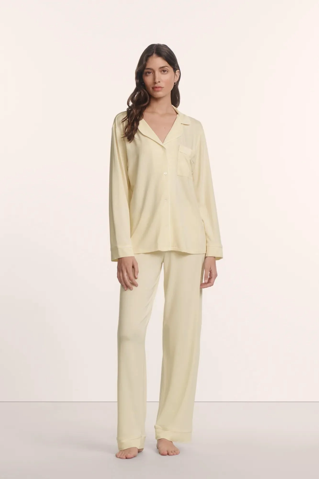 The PJ that started it all. Made from TENCEL™ Modal fibers and a touch of elastane, this buttery soft fabric is verified by OEKO-TEX® Standard 100, meaning it’s dyed with safe and non-toxic dyes. This relaxed long sleeve set features contrast piping, a button-front top with a notch collar and functional pocket, and a low-rise straight leg pant with a thin elastic waistband. Pairs well with our everyday lingerie and blissful ZZZ’s. Color: Buttercream/Ivory DESIGN & FIT - Button-front, notch collar, long sleeve, functional chest pocket - Low-rise straight-leg pant with thin elastic waistband - Inseam: 30.5” - Relaxed Fit Top — roomy, easy silhouette for effortless comfort - Classic Fit Pant— true to size, comfortable for everyday wear FABRIC & CARE - Fabric: 95% TENCEL™ Modal, 5% Elastane — ultra-soft, breathable, and naturally drapes for all-day comfort. - Turn inside out before washing. Machine wash cold with like colors on a gentle cycle. Use only non-chlorine bleach when needed. Tumble dry low. Warm iron if necessary. - Imported.