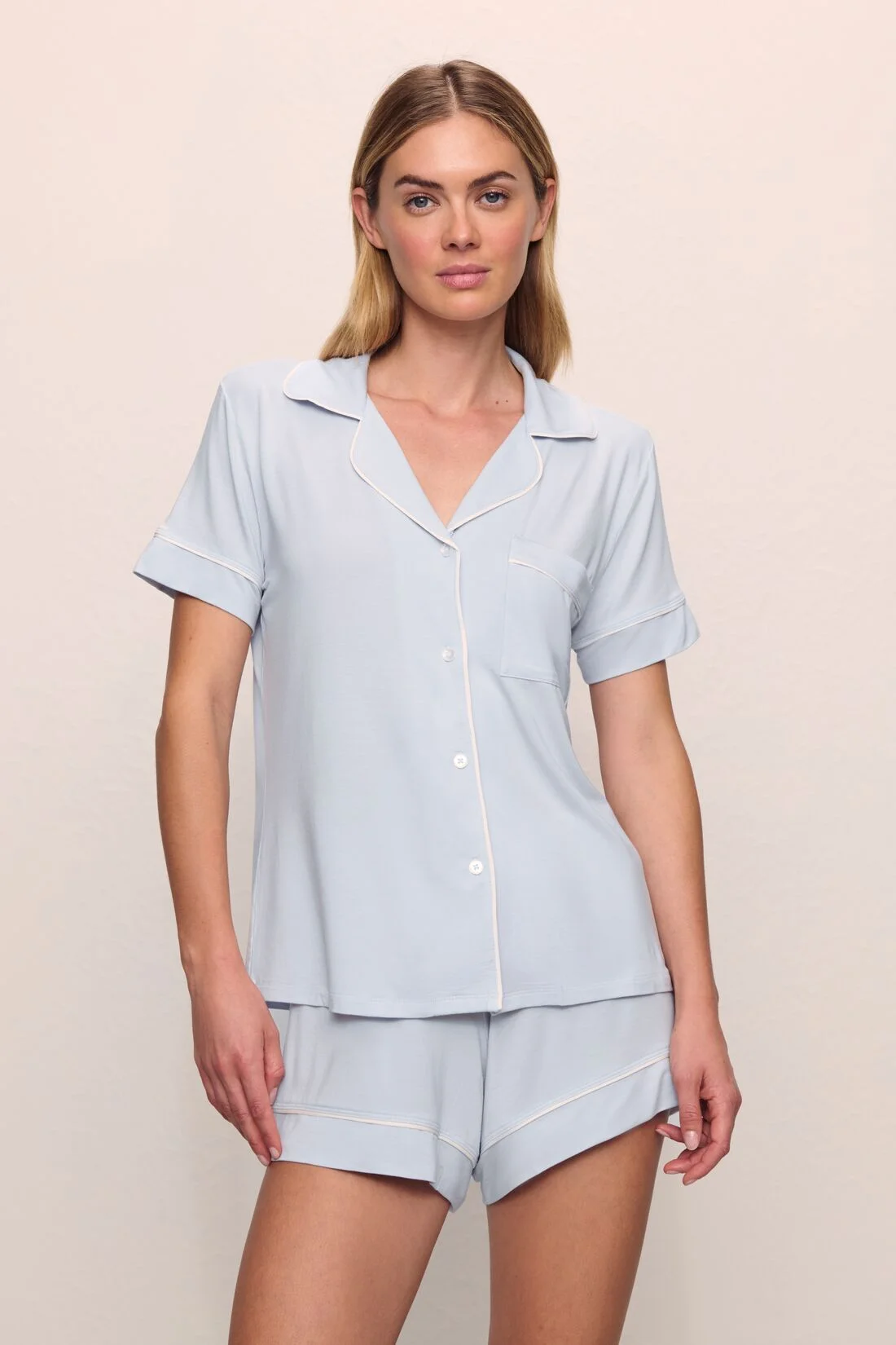 The PJ that started it all. Made from TENCEL™ Modal fibers and a touch of elastane, this buttery soft fabric is verified by OEKO-TEX® Standard 100, meaning it’s dyed with safe and non-toxic dyes. This relaxed set has a roomy shape, extra coverage, and a comfortable fit that you can wear and gift with confidence. The short sleeve top features a loose fit, button front, notch collar, and functional pocket, paired with relaxed shorts for ease and comfort. Pairs well with our everyday lingerie and blissful ZZZ’s. Color: Ice Blue/Ivory DESIGN & FIT - Button-front, notch collar, short sleeve, functional chest pocket - Mid-rise boyfriend-fit short with thin elastic waistband - Inseam: 2.5” - Relaxed Fit — roomy, easy silhouette for effortless comfort FABRIC & CARE - Fabric: 95% TENCEL™ Modal, 5% Elastane — ultra-soft, breathable, and naturally drapes for all-day comfort. - Turn inside out before washing. Machine wash cold with like colors on a gentle cycle. Use only non-chlorine bleach when needed. Tumble dry low. Warm iron if necessary. - Imported.