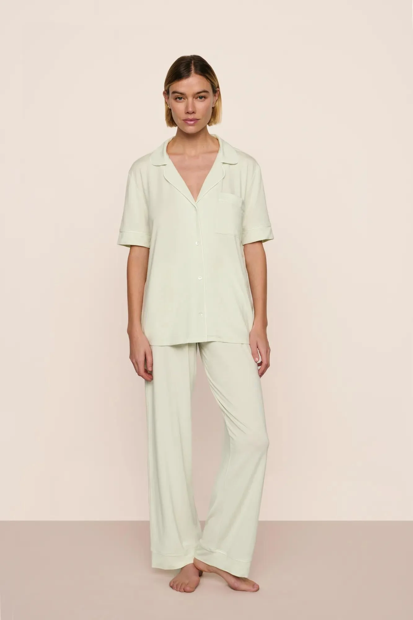 The PJ that started it all. Made from TENCEL™ Modal fibers and a touch of elastane, this buttery soft fabric is verified by OEKO-TEX® Standard 100, meaning it’s dyed with safe and non-toxic dyes. This set features a classic fit top with elbow-length sleeves, a button front, notch collar, and functional pocket. The low-rise straight leg pant features an elastic waistband and contrast piping for a polished look. Pairs well with our everyday lingerie and blissful ZZZ’s. Color: Seafoam/Ivory DESIGN & FIT - Button-front, notch collar, short sleeve, functional chest pocket - Low-rise straight-leg pant with thin elastic waistband - Inseam: 30.5” - Relaxed Fit Top — roomy, easy silhouette for effortless comfort - Classic Fit Bottom — true to size, comfortable for everyday wear FABRIC & CARE - Fabric: 95% TENCEL™ Modal, 5% Elastane — ultra-soft, breathable, and naturally drapes for all-day comfort. - Turn inside out before washing. Machine wash cold with like colors on a gentle cycle. Use only non-chlorine bleach when needed. Tumble dry low. Warm iron if necessary. - Imported.