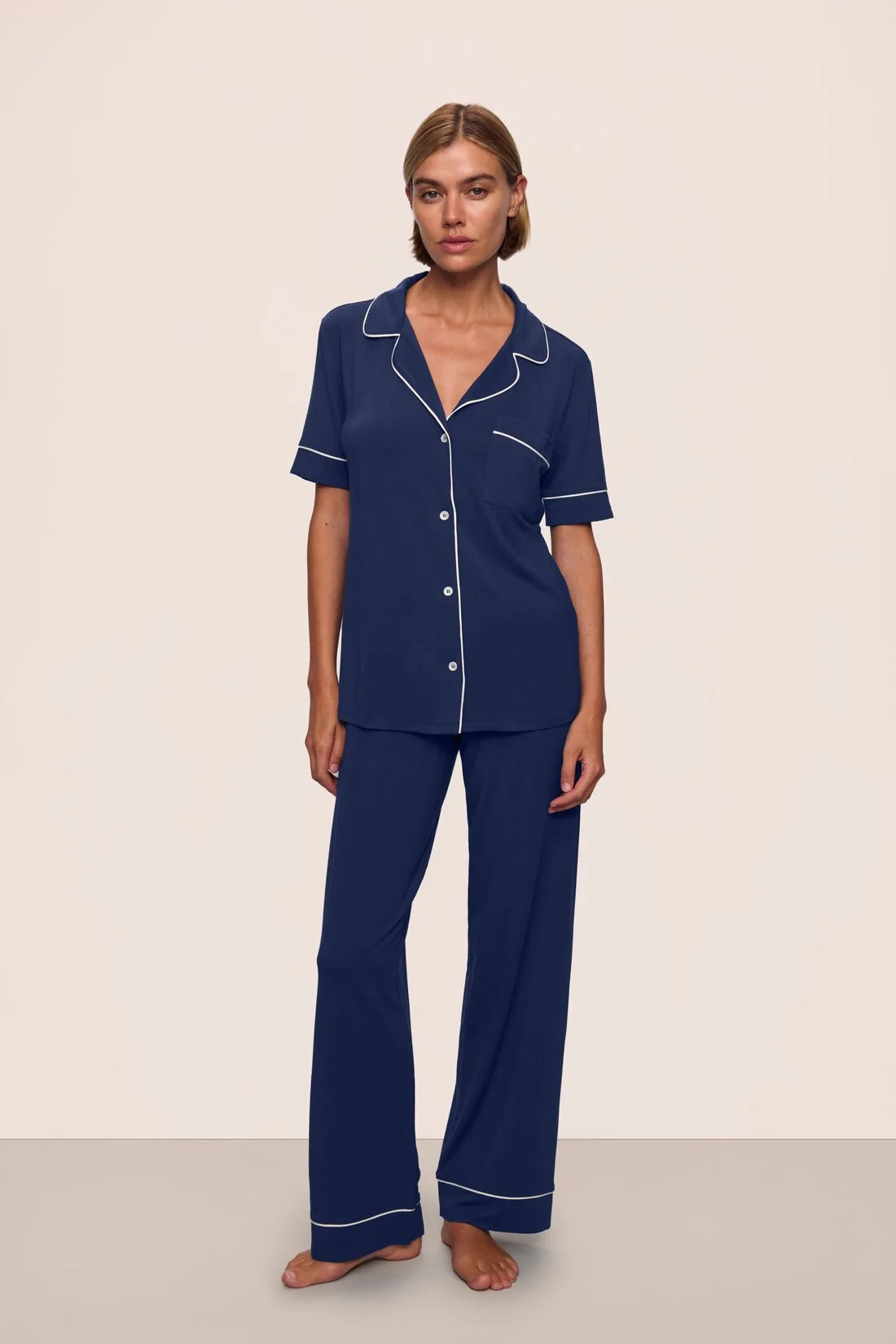 The PJ that started it all. Made from TENCEL™ Modal fibers and a touch of elastane, this buttery soft fabric is verified by OEKO-TEX® Standard 100, meaning it’s dyed with safe and non-toxic dyes. This set features a classic fit top with elbow-length sleeves, a button front, notch collar, and functional pocket. The low-rise straight leg pant features an elastic waistband and contrast piping for a polished look. Pairs well with our everyday lingerie and blissful ZZZ’s. Color: Navy/Ivory DESIGN & FIT - Button-front, notch collar, short sleeve, functional chest pocket - Low-rise straight-leg pant with thin elastic waistband - Inseam: 30.5” - Relaxed Fit Top — roomy, easy silhouette for effortless comfort - Classic Fit Bottom — true to size, comfortable for everyday wear FABRIC & CARE - Fabric: 95% TENCEL™ Modal, 5% Elastane — ultra-soft, breathable, and naturally drapes for all-day comfort. - Turn inside out before washing. Machine wash cold with like colors on a gentle cycle. Use only non-chlorine bleach when needed. Tumble dry low. Warm iron if necessary. - Imported.