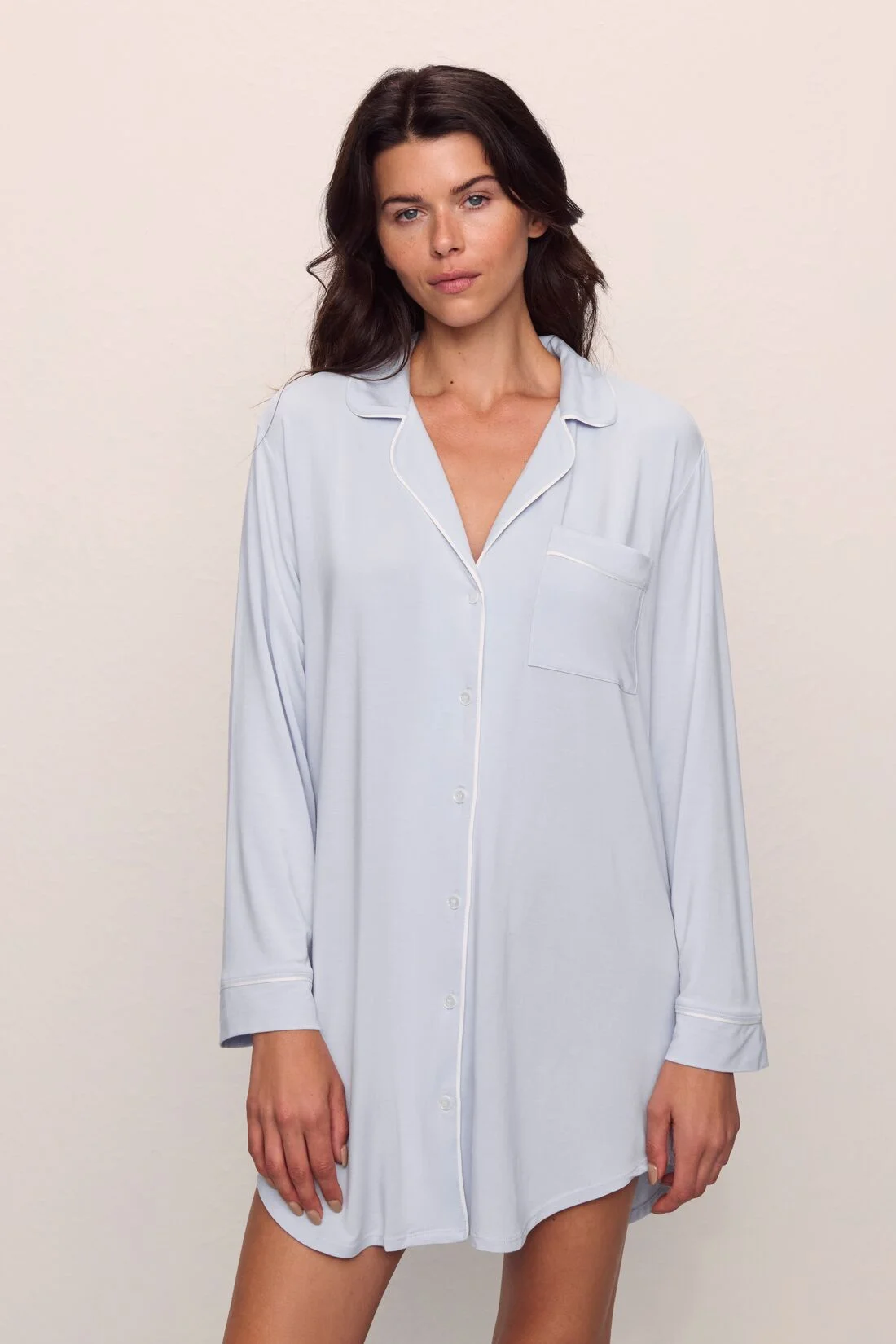 In the mid-2000s, we set out to create the world’s softest pajamas for a beautiful night’s rest. Gisele delivers, merging a classic men’s PJ silhouette with sustainable TENCEL™ Modal fibers. Our luxurious, temperature-regulating knit fabric drapes and falls in all the right ways, enveloping the body in comfort. Plus, it’s machine washable, and gentle on skin, so it not only feels beautiful but it’s easy to care for, too. The sleepshirt is a feminine take on our classic PJ set with the same relaxed fit you’ll love. Color: Ice Blue/Ivory DESIGN & FIT - Button front, long sleeve sleepshirt with notch collar and functional pocket - Curved hem - Classic Fit — true to size, comfortable for everyday wear FABRIC & CARE - Fabric: 95% TENCEL™ Modal, 5% Elastane — ultra-soft, breathable, and naturally drapes for all-day comfort. - Turn inside out before washing. Machine wash cold with like colors on a gentle cycle. Use only non-chlorine bleach when needed. Tumble dry low. Warm iron if necessary. - Imported.