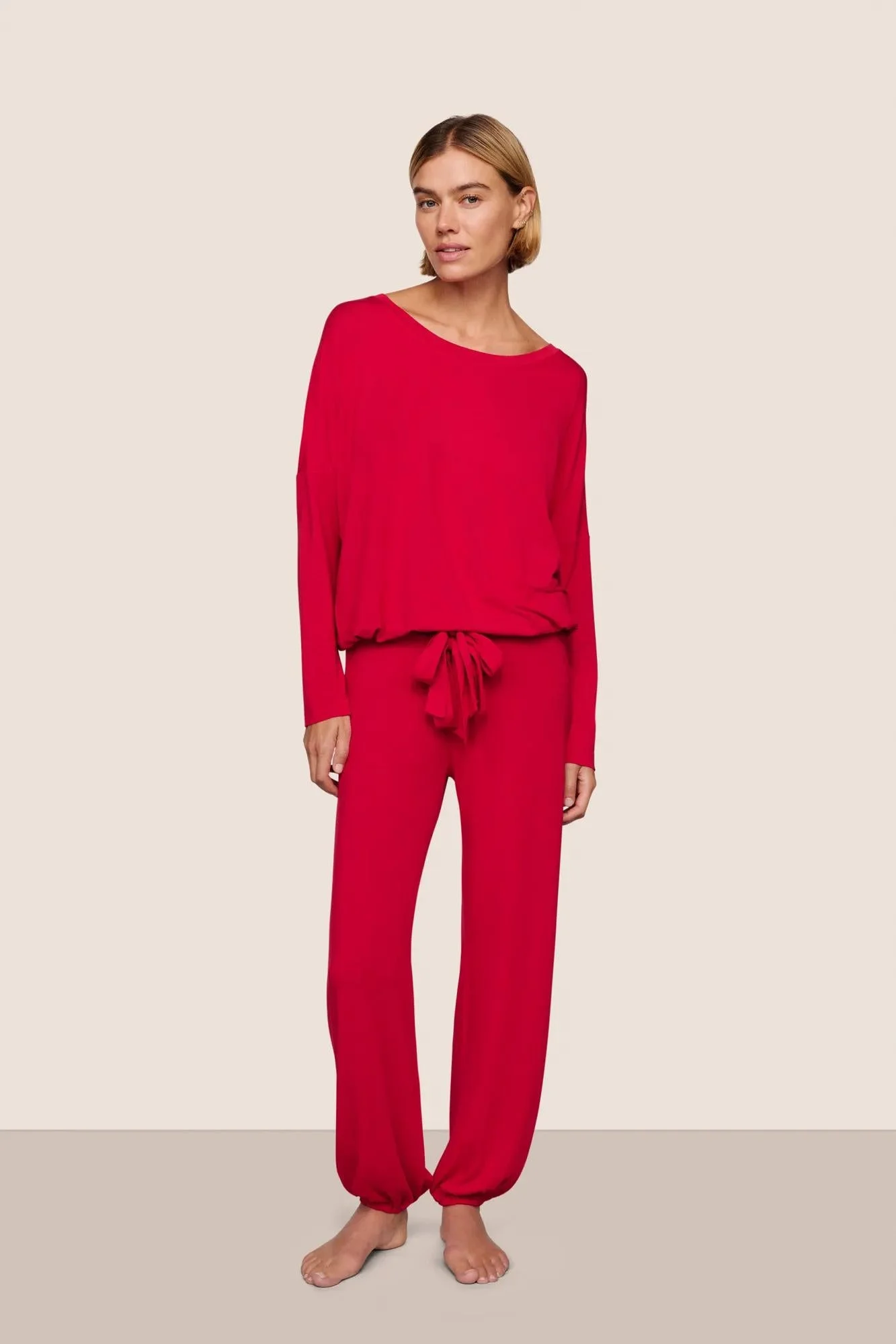 In the mid-2000s, we set out to create the world’s softest pajamas for a beautiful night’s rest. Gisele delivers, merging a classic men’s PJ silhouette with sustainable TENCEL™ Modal fibers. Our luxurious, temperature-regulating knit fabric drapes and falls in all the right ways, enveloping the body in comfort. Plus, it’s machine washable, and gentle on skin, so it not only feels beautiful but it’s easy to care for, too. With its relaxed, slouchy styling and adjustable ties for a custom fit, this set will give you a comfortable night’s sleep. Color: Holly Red/Holly Red DESIGN & FIT - Long sleeve, relaxed drop shoulder with open crew neckline, adjustable tie hem - Low-rise slouchy pant with elasticated hem, adjustable tie waistband - Inseam: 26.25” - Relaxed Fit — roomy, easy silhouette for effortless comfort FABRIC & CARE - Fabric: 95% TENCEL™ Modal, 5% Elastane — ultra-soft, breathable, and naturally drapes for all-day comfort. - Turn inside out before washing. Machine wash cold with like colors on a gentle cycle. Use only non-chlorine bleach when needed. Tumble dry low. Warm iron if necessary. - Imported.