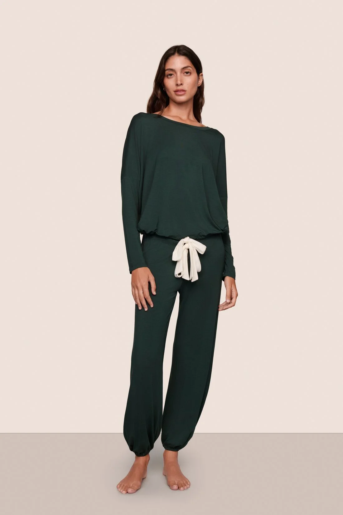 In the mid-2000s, we set out to create the world’s softest pajamas for a beautiful night’s rest. Gisele delivers, merging a classic men’s PJ silhouette with sustainable TENCEL™ Modal fibers. Our luxurious, temperature-regulating knit fabric drapes and falls in all the right ways, enveloping the body in comfort. Plus, it’s machine washable, and gentle on skin, so it not only feels beautiful but it’s easy to care for, too. With its relaxed, slouchy styling and adjustable ties for a custom fit, this set will give you a comfortable night’s sleep. Color: Pine/Ivory DESIGN & FIT - Long sleeve, relaxed drop shoulder with open crew neckline, adjustable tie hem - Low-rise slouchy pant with elasticated hem, adjustable tie waistband - Inseam: 26.25” - Relaxed Fit — roomy, easy silhouette for effortless comfort